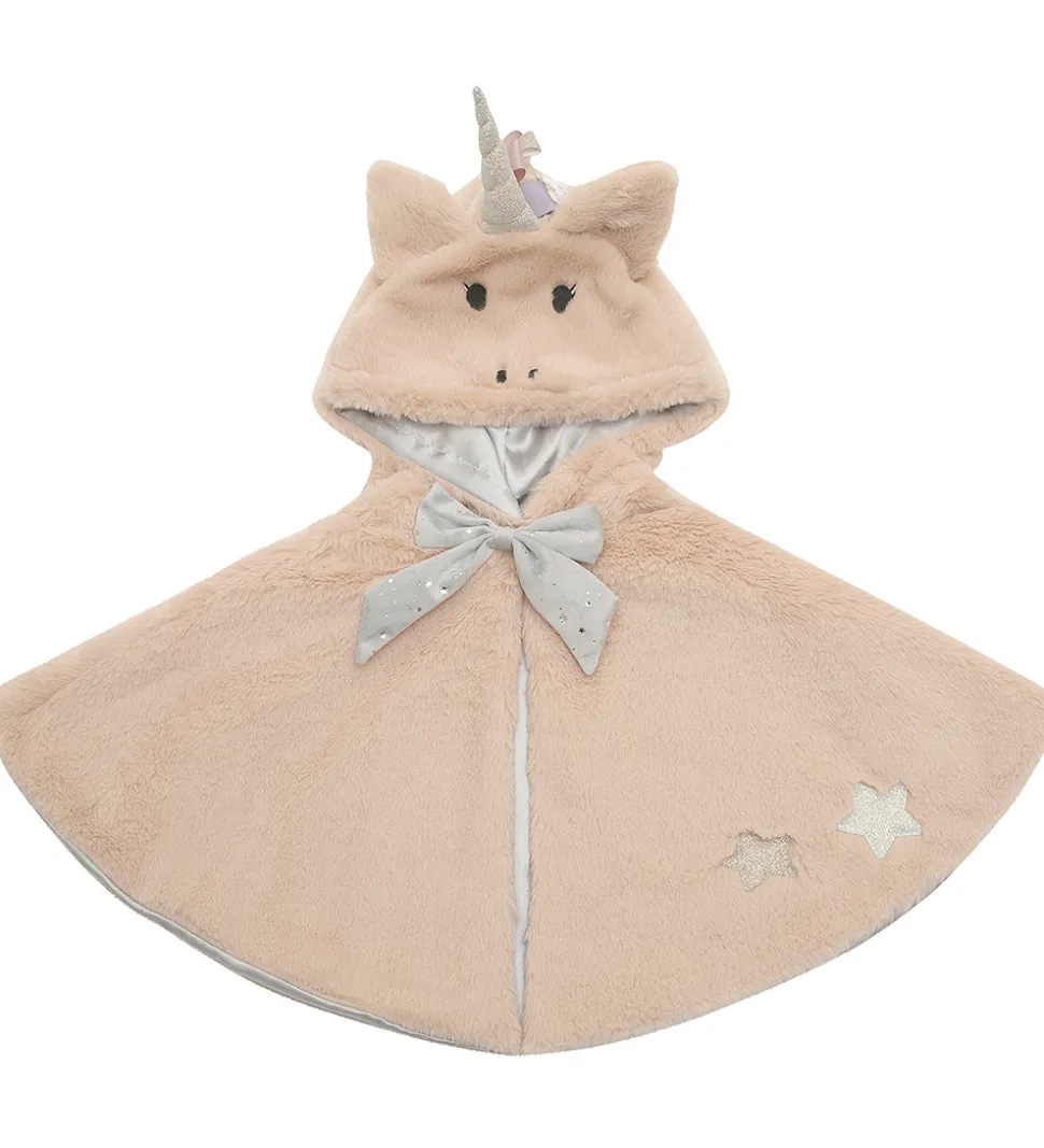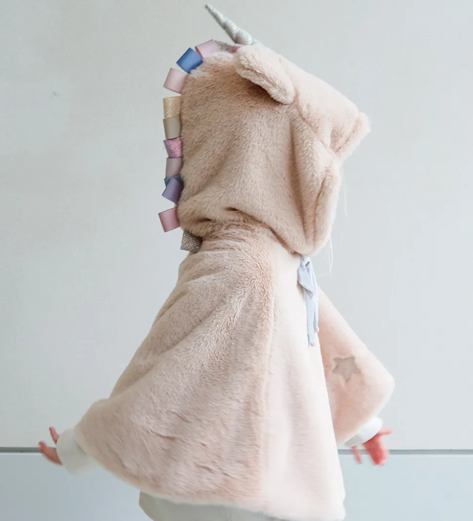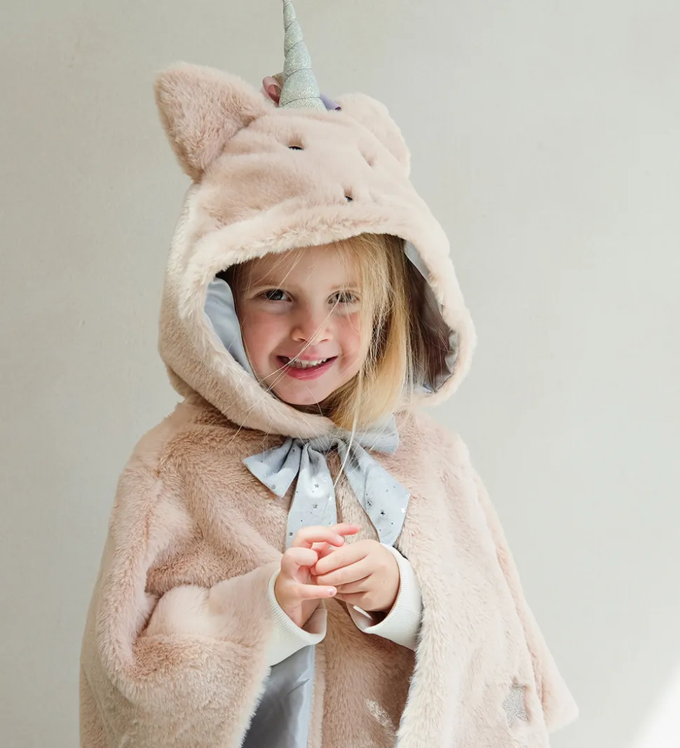 Sød Mimi & Lula kappe, der er en enhjørninge-udklædning, i rosa plys med flotte glimmerdetaljer.