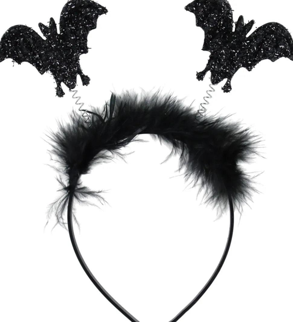Charmerende Molly & Rose hårbøjle i sort med funklende flagermuse-figurer. Molly & Rose pandebåndet er dekoreret med fjer, der giver et legende og fantasifuldt udtryk. Molly & Rose hårbøjlen er det perfekte tilbehør til udklædningen.
