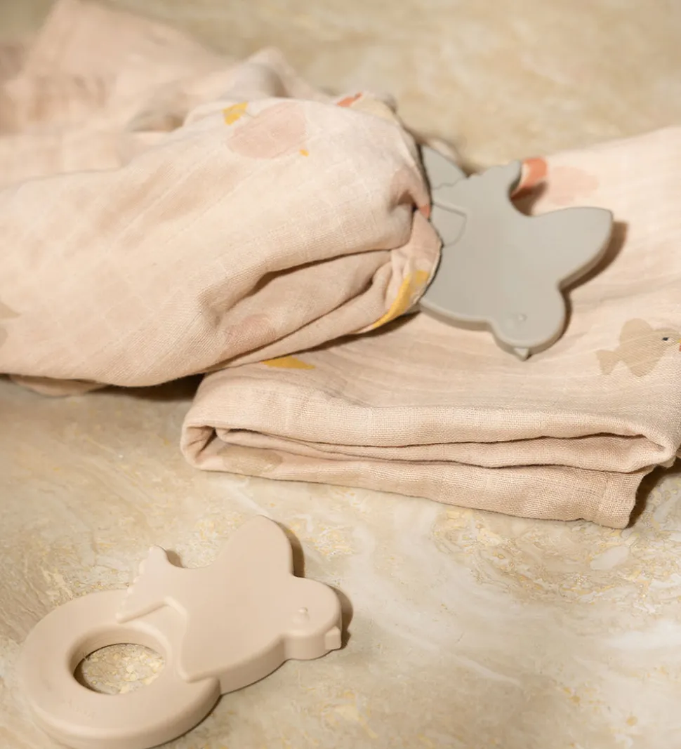 Praktiske Moonboon bideringe solgt i en 2-pak i en flot lys rosa og gråbrun nuance. Bideringene har form som en fugl på toppen.