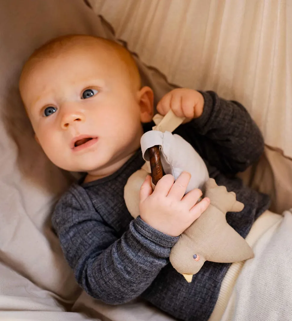 Ophænget har en praktisk velcrostrop i toppen, der gør den er let at hænge på tremmesengen, aktivitetsstativet eller barnevognen.