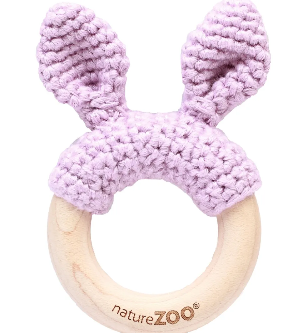 NatureZoo bideringen er god at bide i og træringen ligger godt i babyhænderne. Kaninørene er i blødt, hæklet materiale.