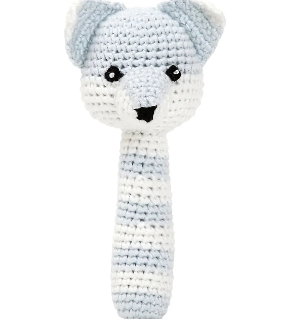 Charmerende NatureZoo rangle i et blåt og hvidt stribet hæklet design. Ranglen har form som en ræv med små, detaljerede øjne og næse, der tilføjer et sødt udtryk.