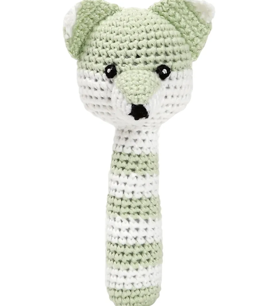 Flot NatureZoo rangle med et charmerende design, der forestiller en ræv. Ranglen har et mønster med striber i lysegrøn og hvid, hvilket giver et roligt udtryk.