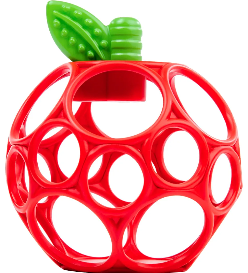 Sjov Oball bidebold i formet som et rødt æble i en hul struktur med gitter og med et grønt blad på toppen, som er en bideflap.