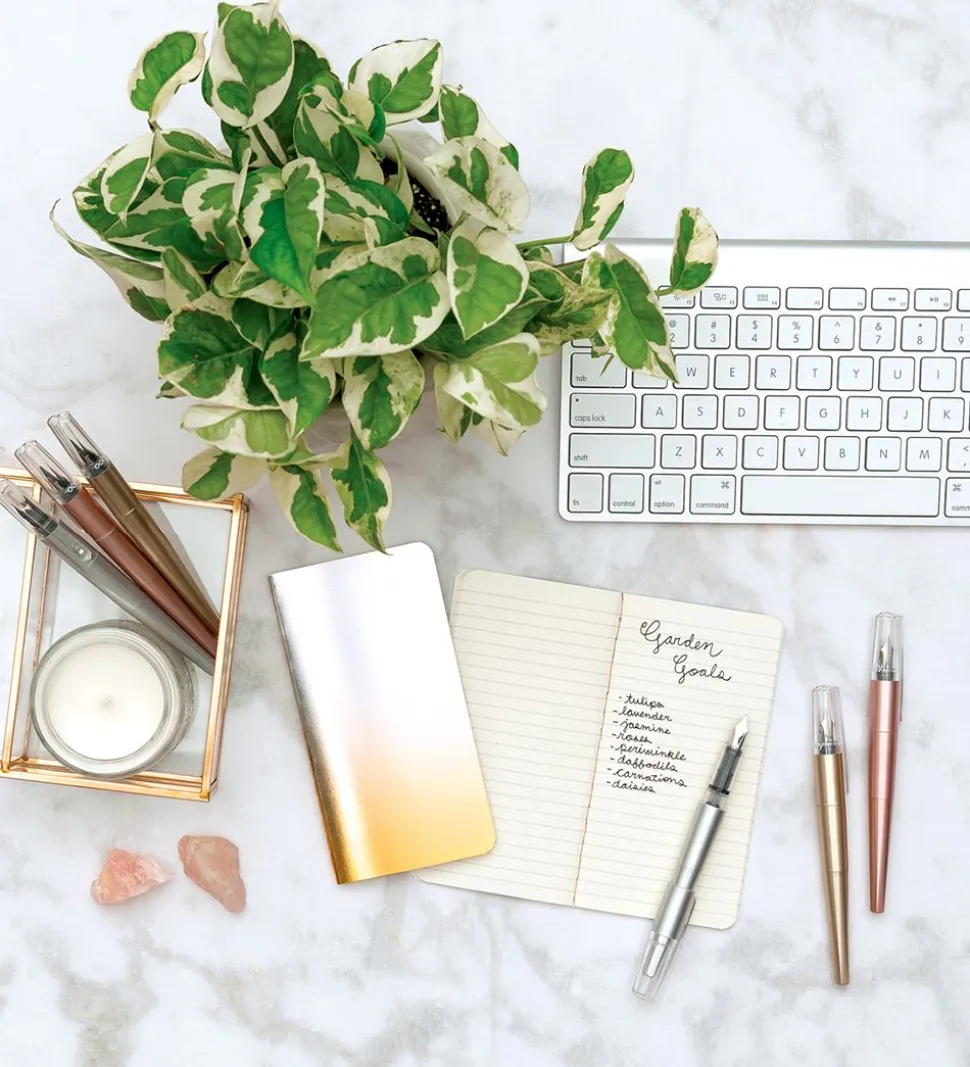 Gode Ooly fyldepenne bestående af tre penne i metalisk bronze, guld og sølv. Der medfølger en notesbog i metalisk sølv og guld.
