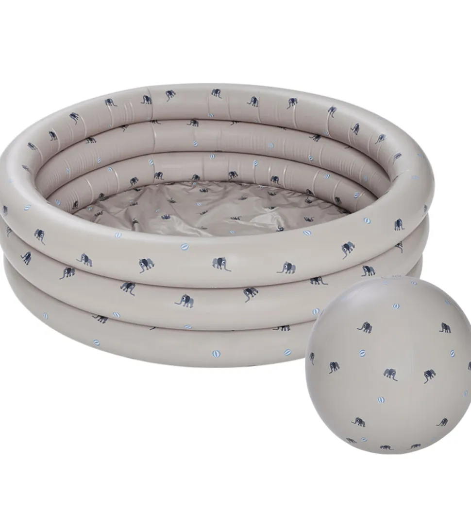 Flot OYOY badebassin med badebold i grå med et alloverprint af blå elefanter og badebolde.