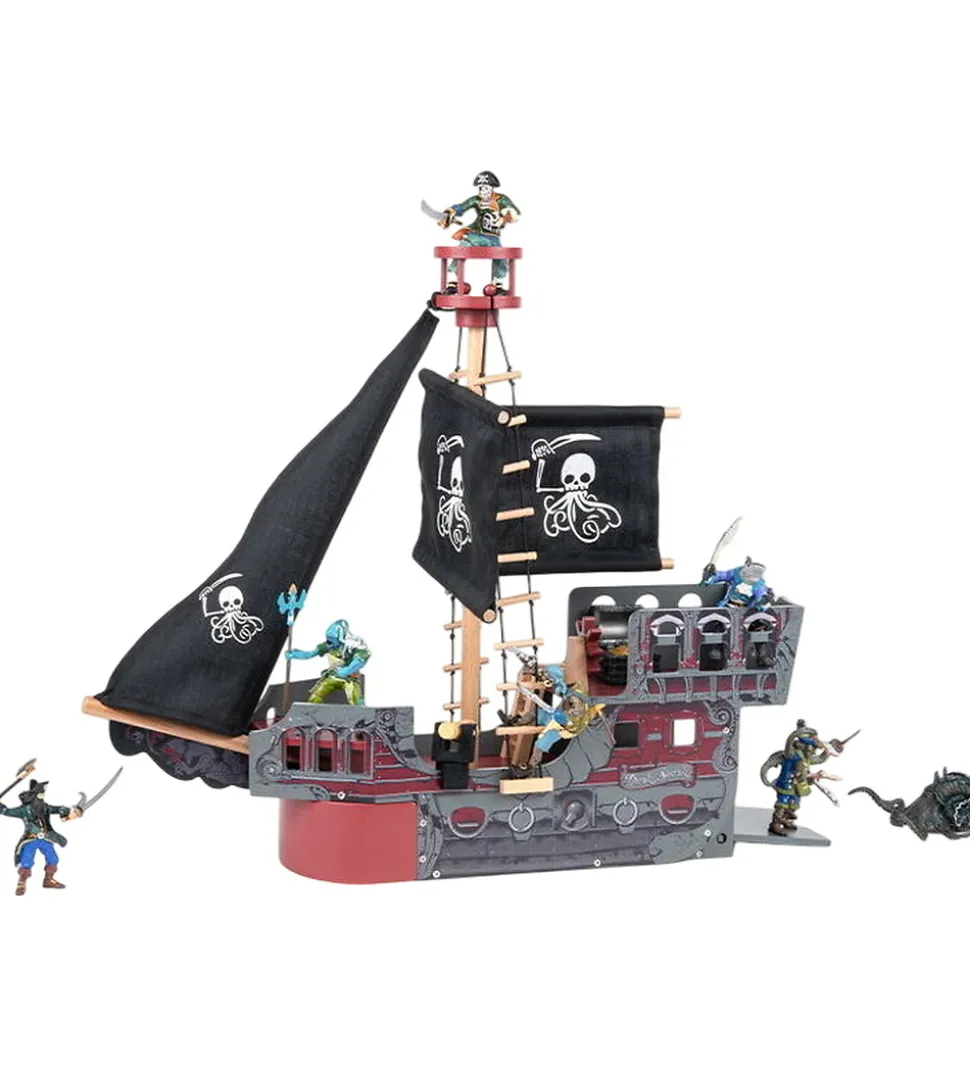 Fantasiskibet er udstyret med sorte stofsejl prydet med et kraniemotiv, som giver et dramatisk udtryk og skræmmer fjendtlige skibe væk. Det robuste design og de mange detaljer gør skibet ideelt til at iscenesætte spændende piratkampe, mytiske rejser og magiske historier.