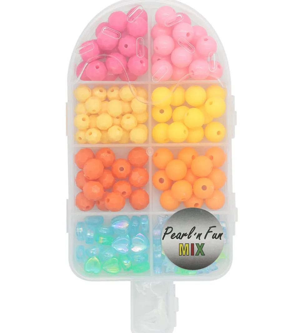 Pearl N Fun perlerne kommer i en opbevaringsæske af plastik og formet som en ispind med 9 rum og indeholder: