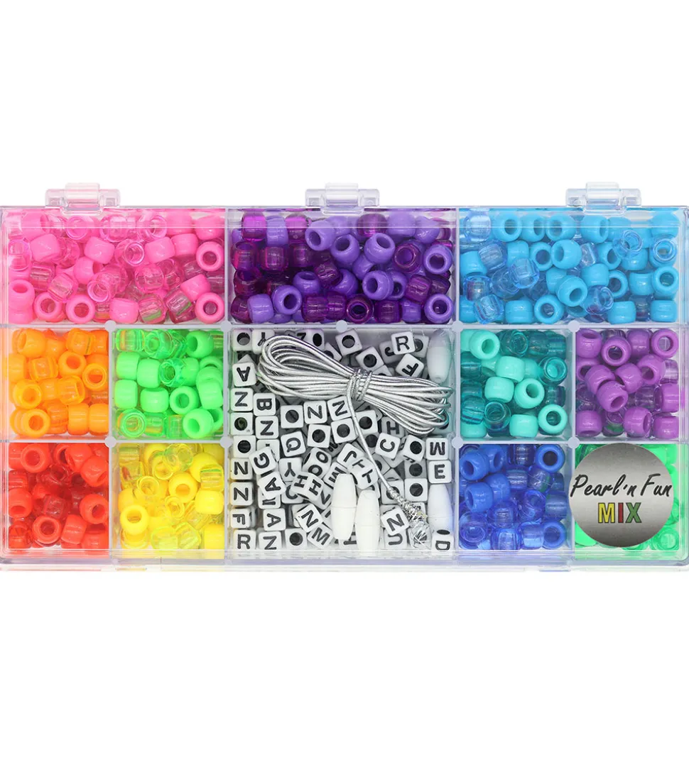 Pearl N Fun perlerne kommer i en opbevaringsæske af plastik med 12 rum og indeholder: