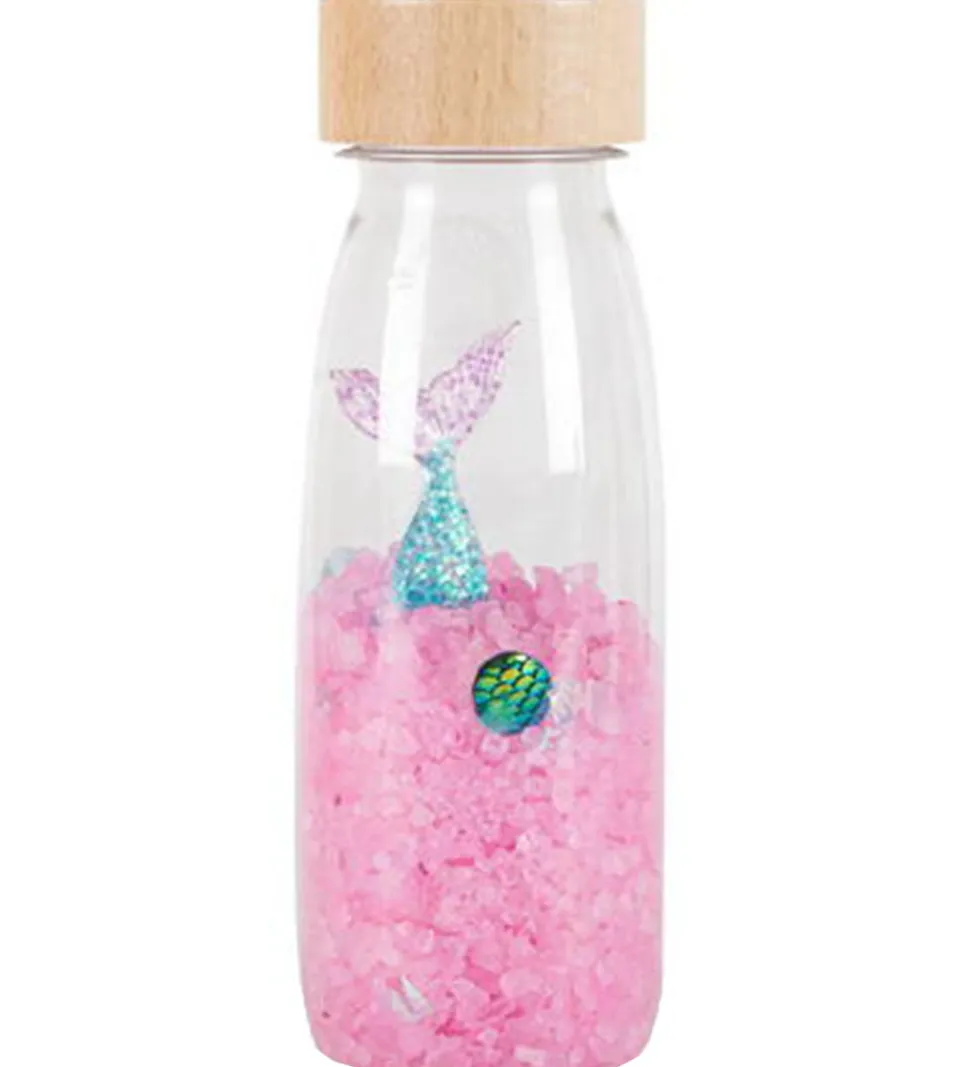 Fint Petit Boum sanselegetøj, der er formet som en flaske med et helt glat trælåg, og inden i flasken ses indholdet, som består af pink konfetti, hvori der gemmer sig en havfruehaler og muslingeskaller.