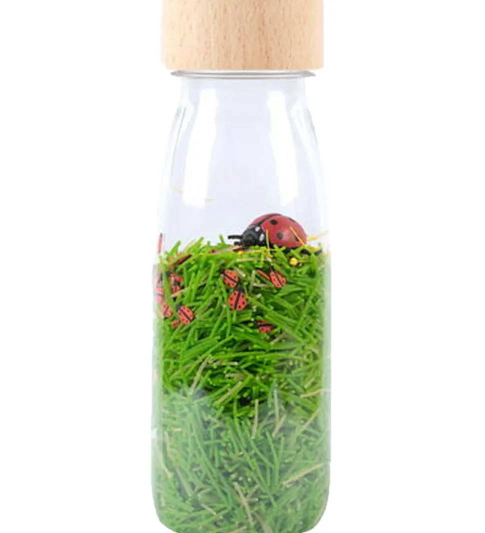 Fint Petit Boum sanselegetøj, der er formet som en flaske med et helt glat trælåg, og inden i flasken ses indholdet, som består af græsformet konfetti, hvori der gemmer sig mariehøns.