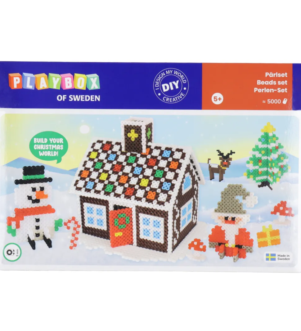 Flot Playbox perlesæt med juletema. Skab et hyggeligt julelandskab med et charmerende peberkagehus og figurer i klare nuancer. Playbox perlesættet indeholder 5000 perler, en perleplade og skabeloner.
