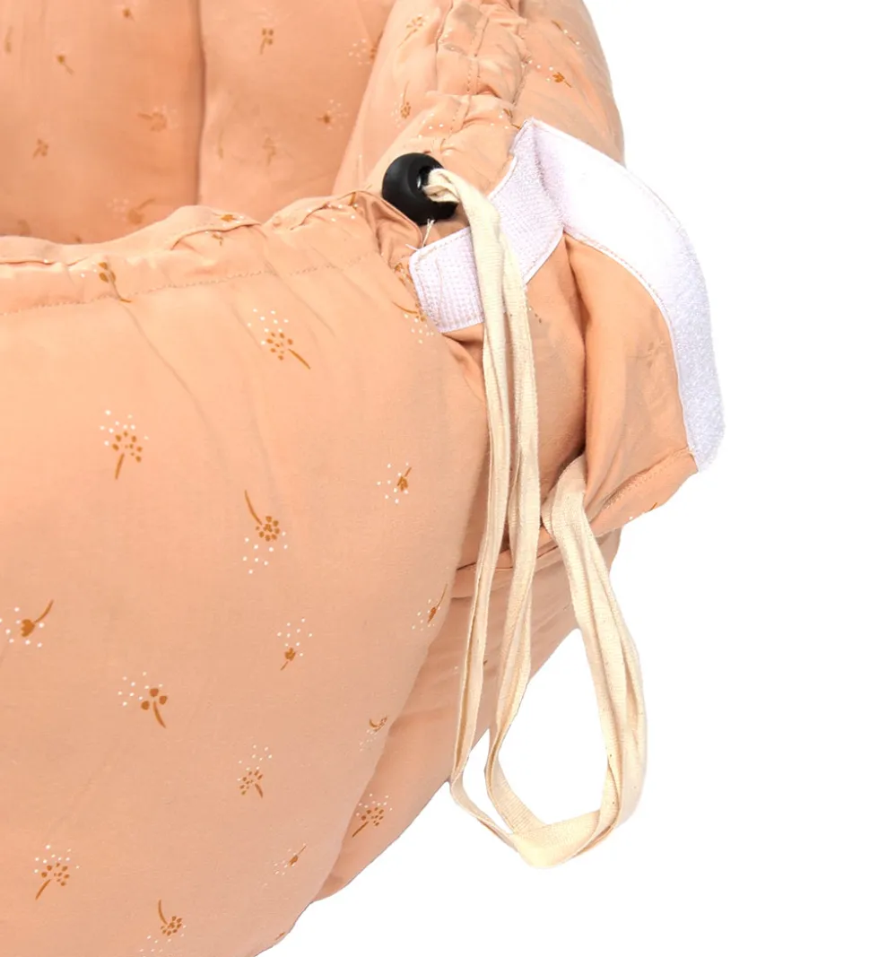 Flot Play&go legetæppe i rosa med et alloverprint af små, fine blomster og prikker i lysebrun og hvid.