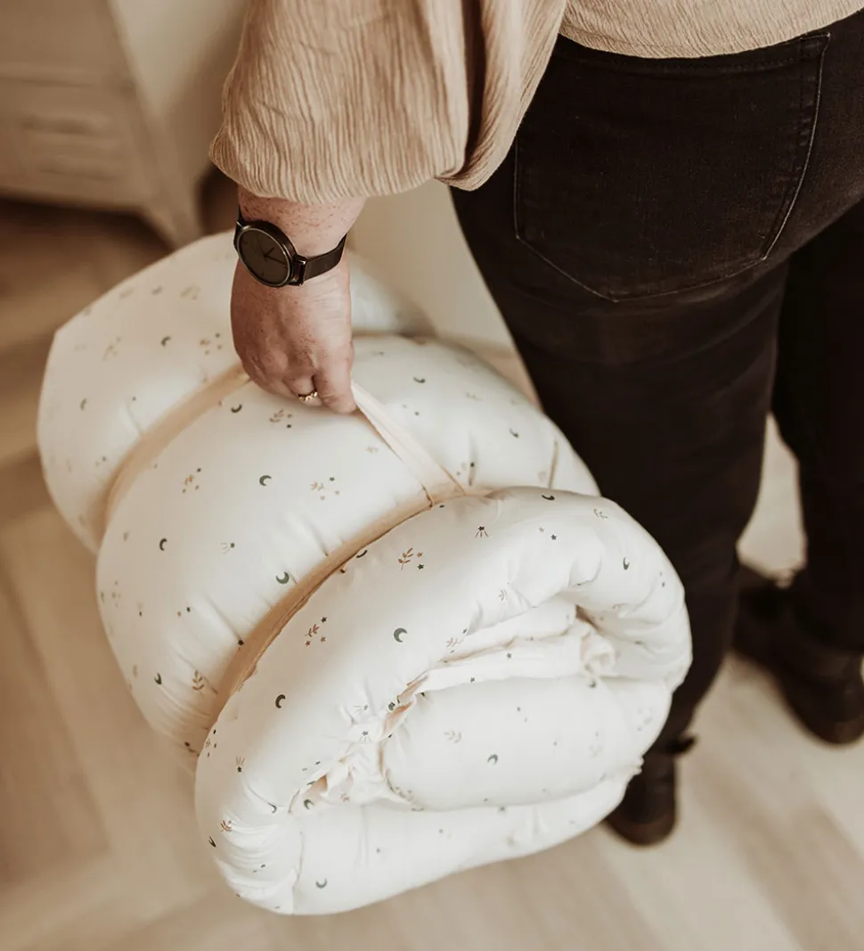 Flot Play&go legetæppe i cremehvid med et alloverprint af små, fine måner, stjerne og grene i blågrøn og lysebrun.