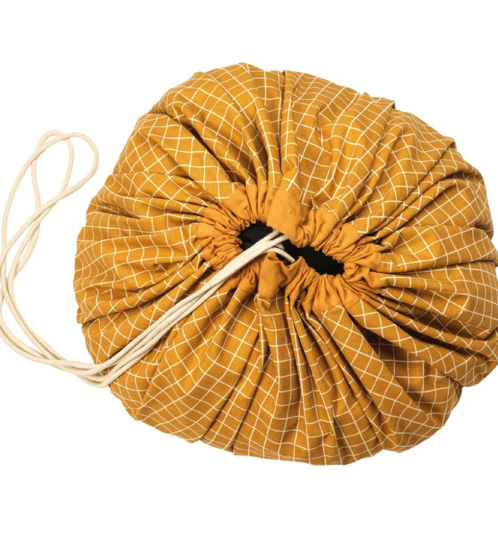 Play&Go legetøjstæppet er et stort cirkelformet stykke stof med en løbegang hele vejen rundt med en hvid snor, så man kan snøre tæppet sammen til en pose. I posen kan man opbevare sit legetøj, og når børnene synes, at legetøjet skal med ind i stuen, kan posen åbnes og legetæppet folder sig ud. Bagefter er det hurtigt og nemt at rydde op og lægge på plads. Den er god at tage med på stranden, da den er vandfast.