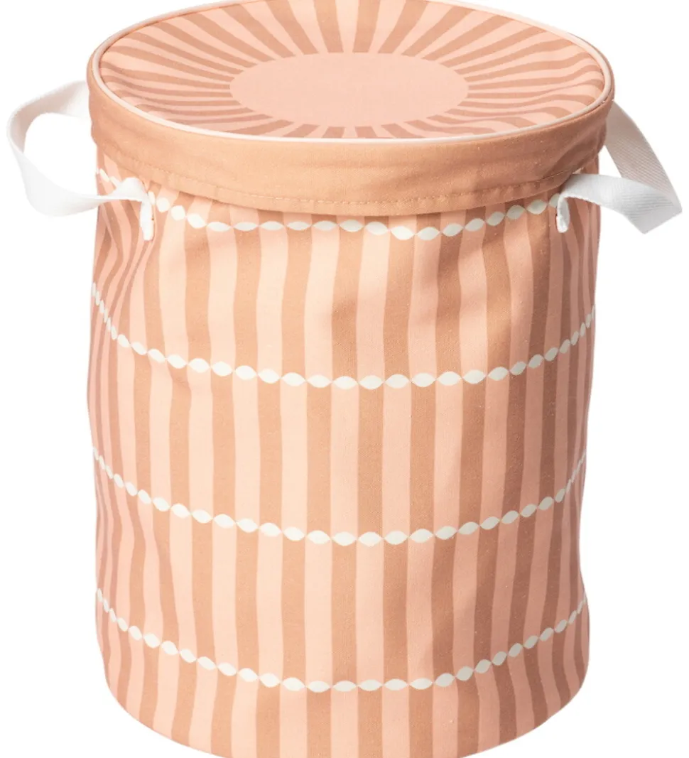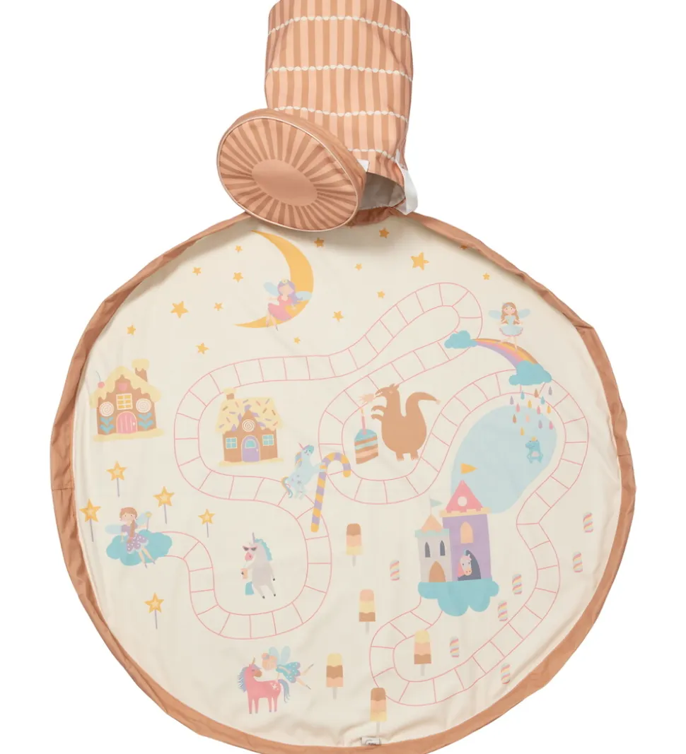 Fint Play&Go legetæppe og kurv med to-i-en funktion. Opbevaringskurven har et mønster i brun og orange med praktiske håndtag i toppen. Legetæppet er hvidt og orange med eventyrligt tema med bymotiv og små veje. Legetæppet sidder fast til kurven i den ene side, så det er nemt at trække legetæppet ud af kurven, og lægge det tilbage, når man ikke skal bruge det. Kurven er praktisk til opbevaring af legetøj, samtidig med at det pynter på børneværelset.