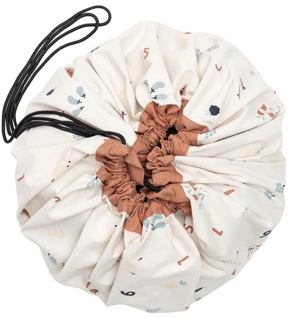Smart Play&Go legetøjstæppe i cremehvid med forskellige grøntsager og antallet af dem på den ene side, og det samme i en mindre version på den anden.