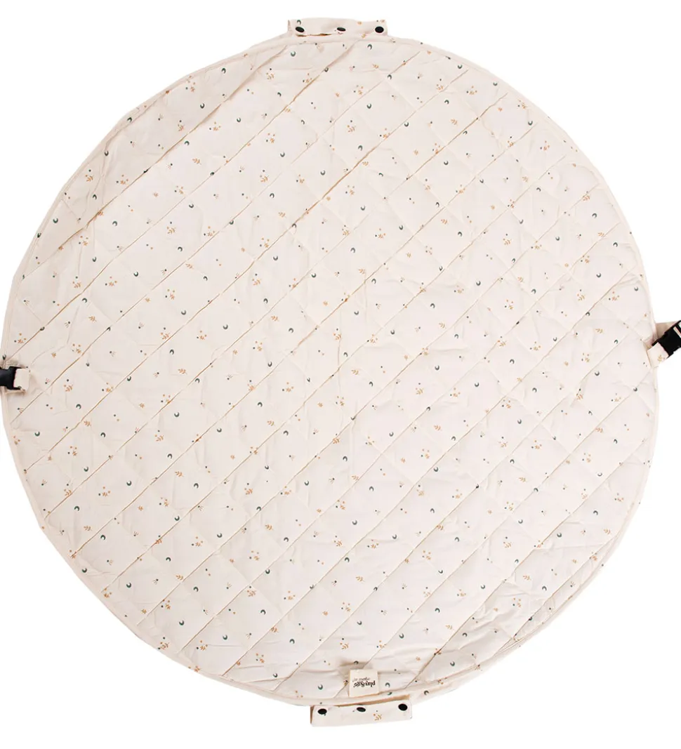 Flot Play&Go legetøjstæppe i cremehvid med et alloverprint af små, fine måner, stjerne og grene i blågrøn og lysebrun.
