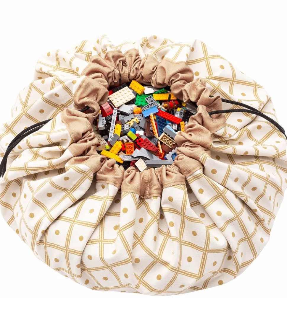 Play&Go legetøjstæppet er et stort cirkelformet stykke stof med en løbegang hele vejen rundt med en sort snor, så man kan snøre tæppet sammen til en pose. I posen kan man opbevare sit legetøj, og når børnene synes, at legetøjet skal med ind i stuen, kan posen åbnes og legetæppet folder sig ud. Bagefter er det hurtigt og nemt at rydde op og lægge på plads.