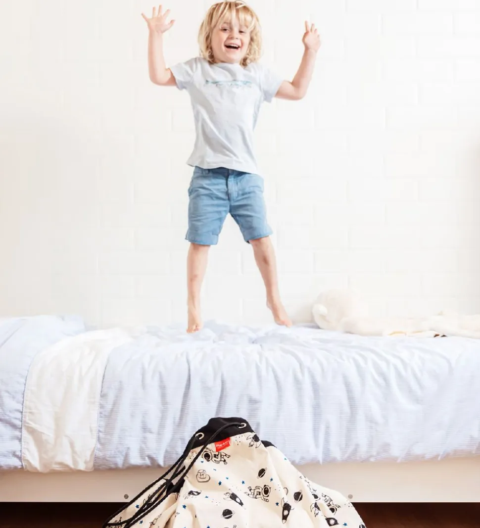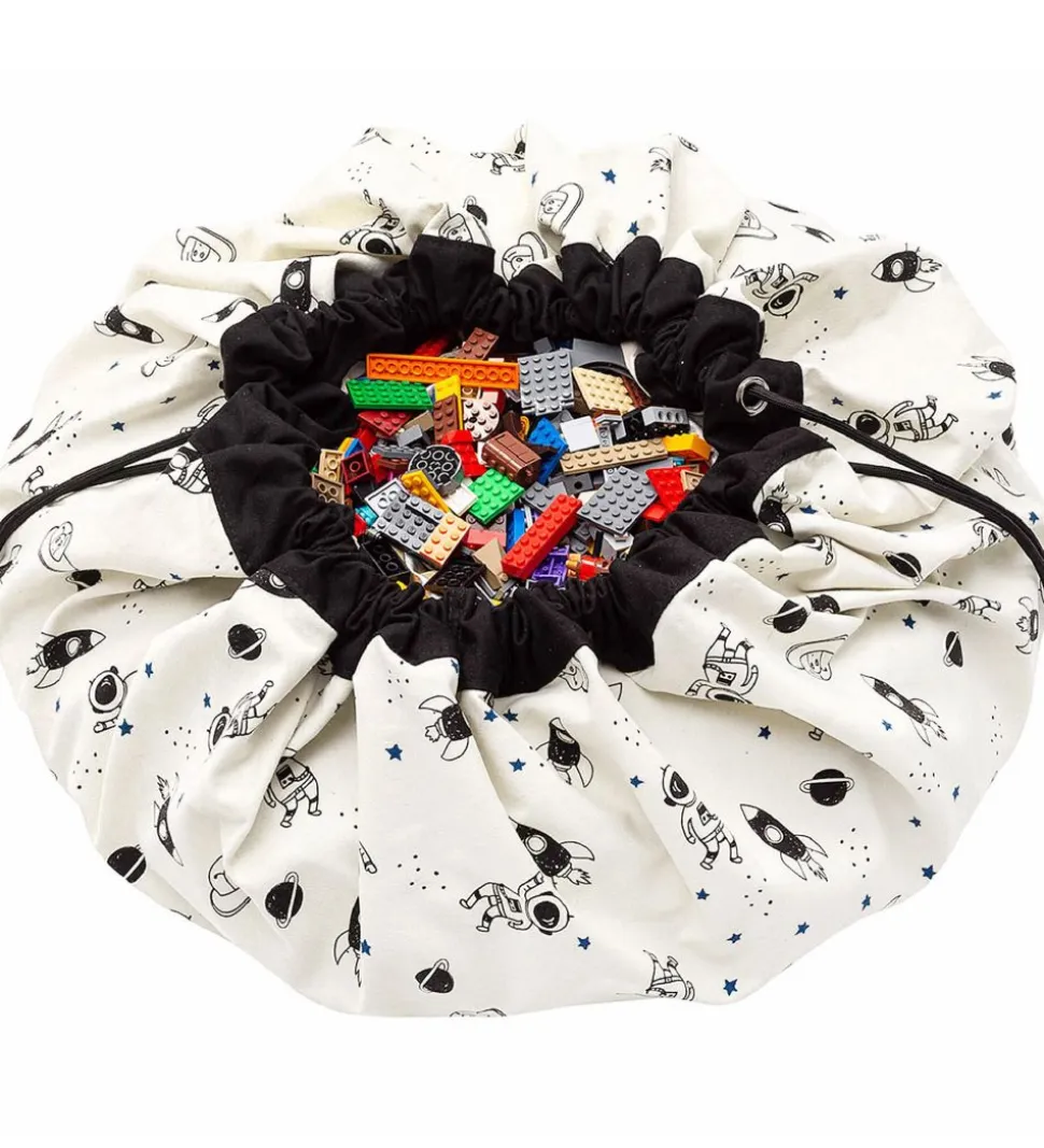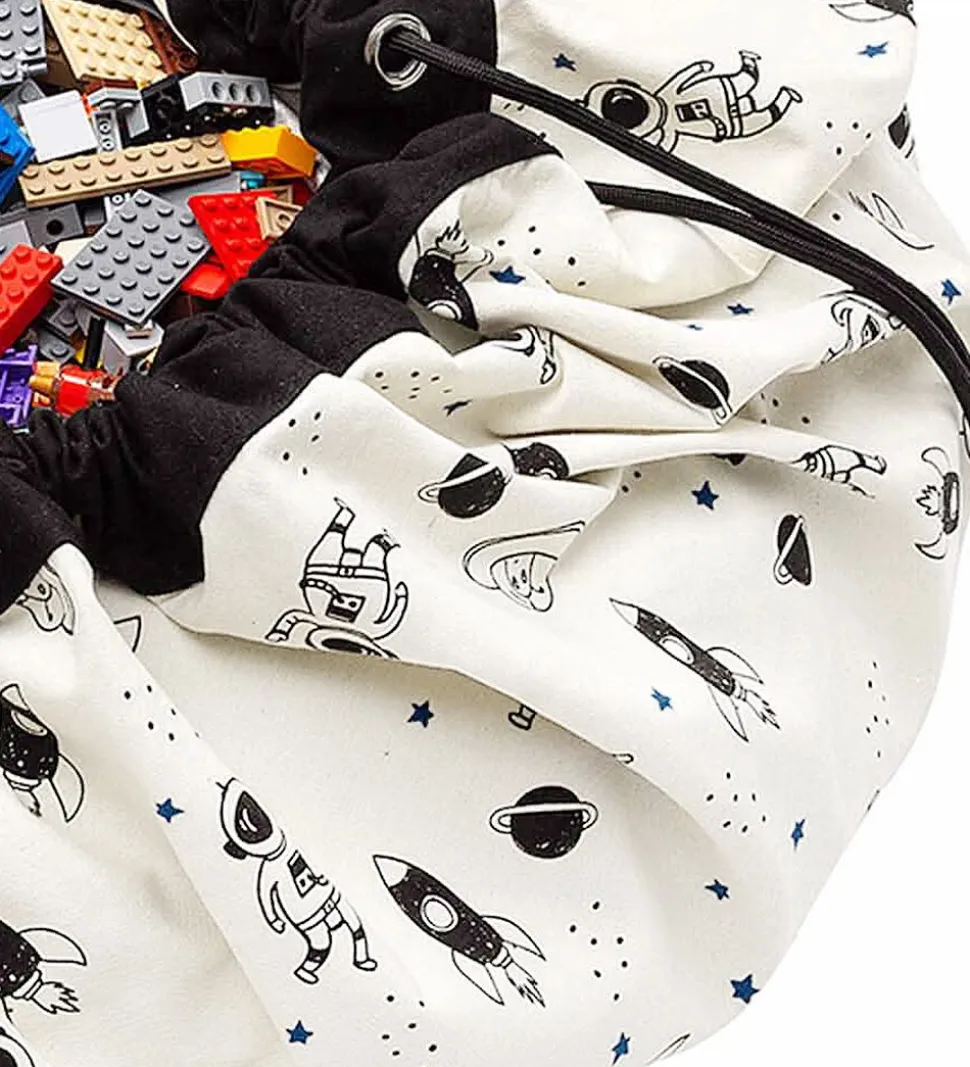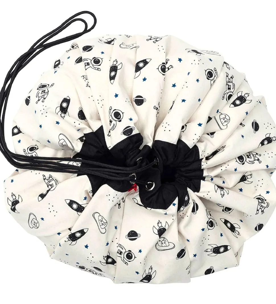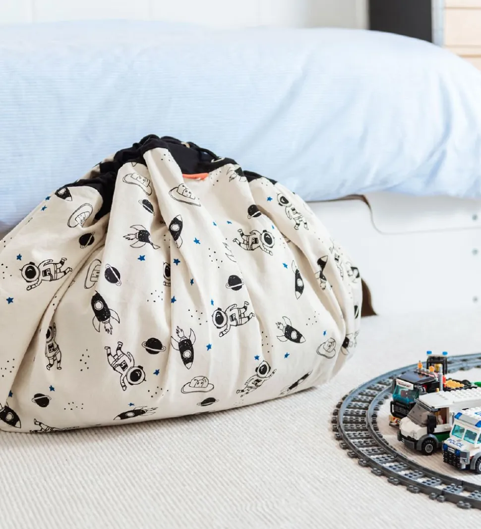 Smart Play&Go legetøjstæppe i cremefarvet kanvas med et flot rumprint på ydersiden. Der er desuden seje selvlysende prints.