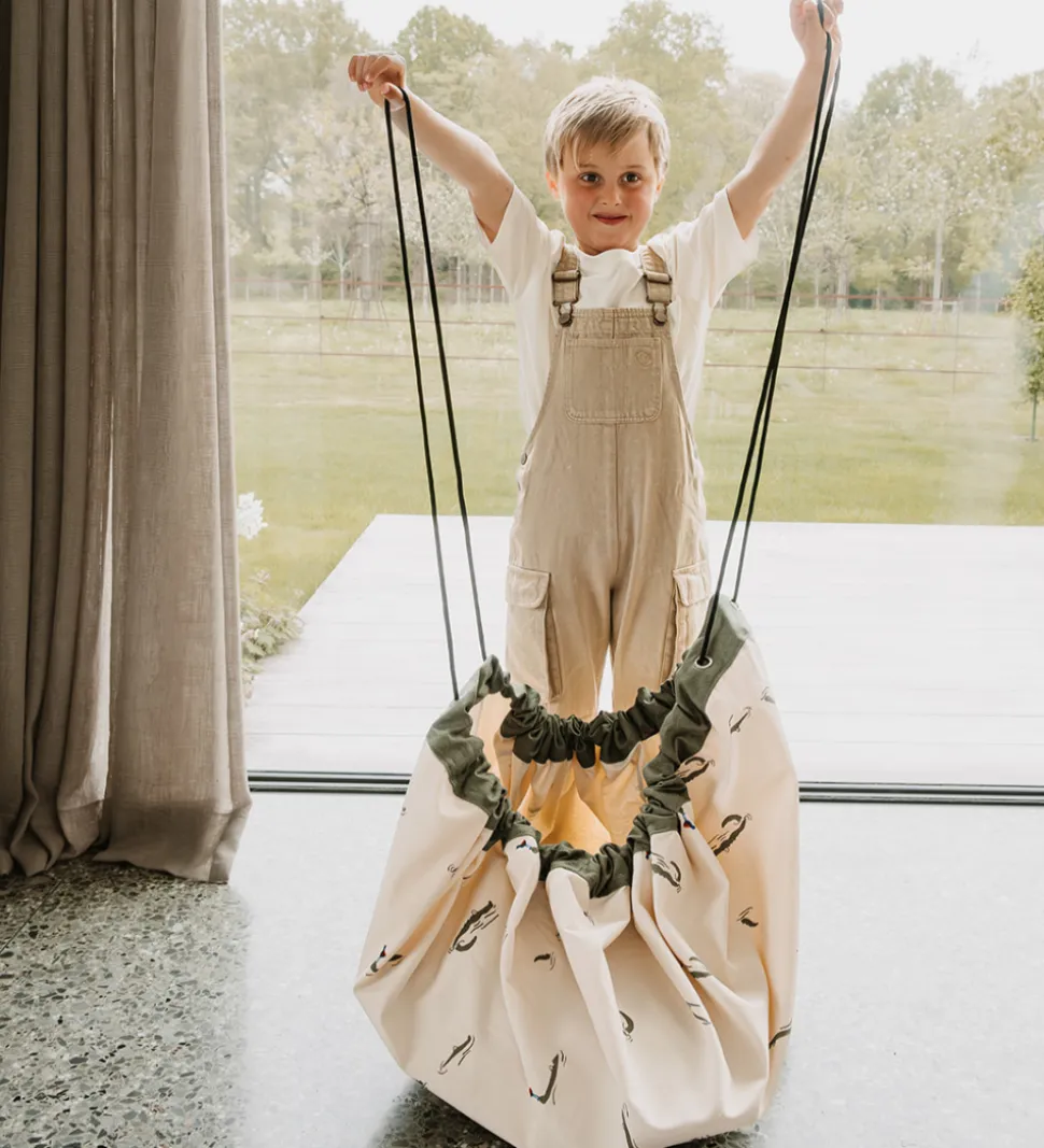 Skønt Play&Go legetæppe og opbevaringspose med to-i-en funktion. Legetæppet er råhvidt med grøn kant og print på den ene side af små krokodiller og fugle. Legetæppet har en rund facon med snore i siderne, som kan trækkes sammen, så legetæppet bliver til en opbevaringspose.