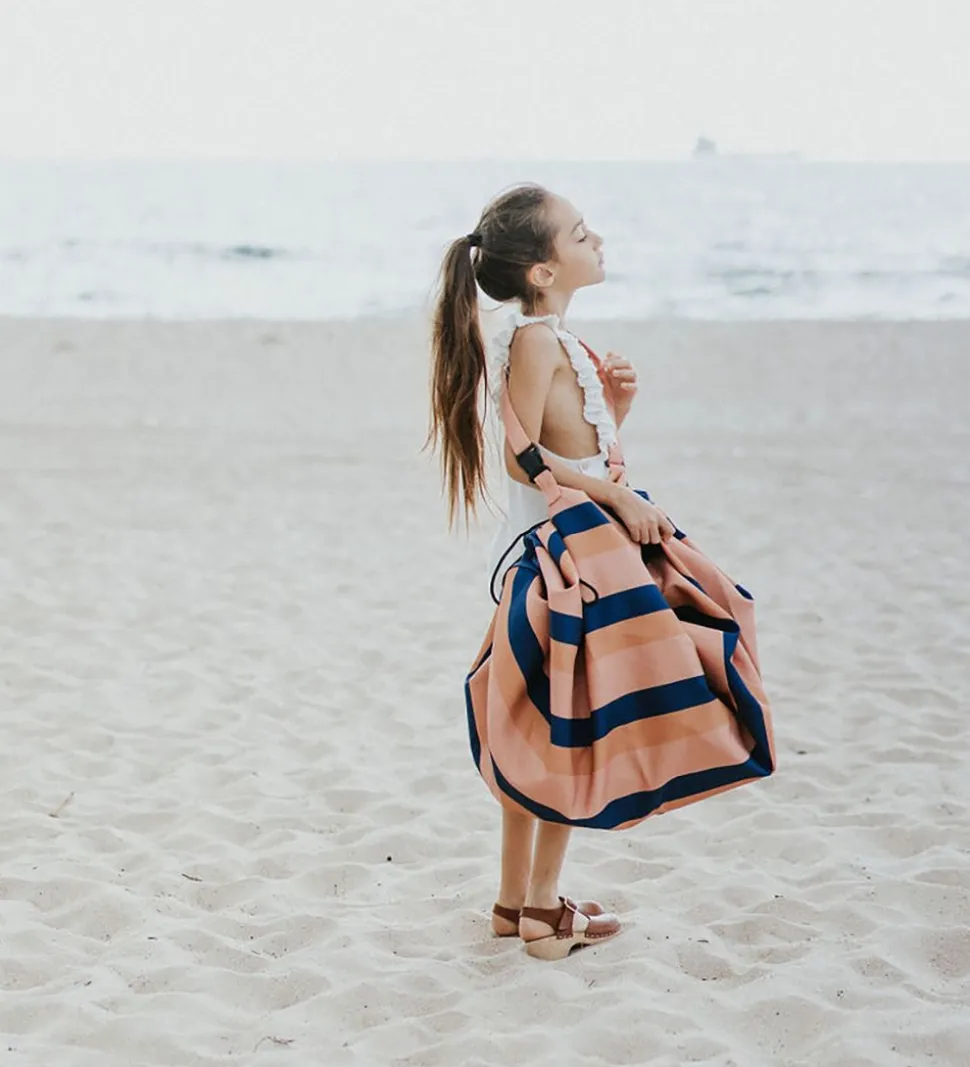 Praktisk Play&Go legetøjstæppe til udendørs aktiviteter i stribet brun, blå og beige, i en lækker PU-kvalitet.