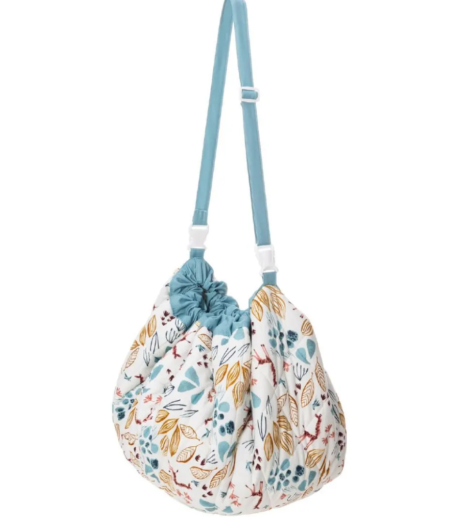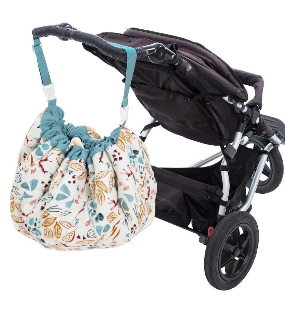 Play&Go legetøjstæppet er et stort cirkelformet stykke stof med en løbegang hele vejen rundt med en sort snor, så man kan snøre tæppet sammen til en pose. I posen kan man opbevare sit legetøj, og når børnene synes, at legetøjet skal med ind i stuen, kan posen åbnes og legetæppet folder sig ud. Bagefter er det hurtigt og nemt at rydde op og lægge på plads.
