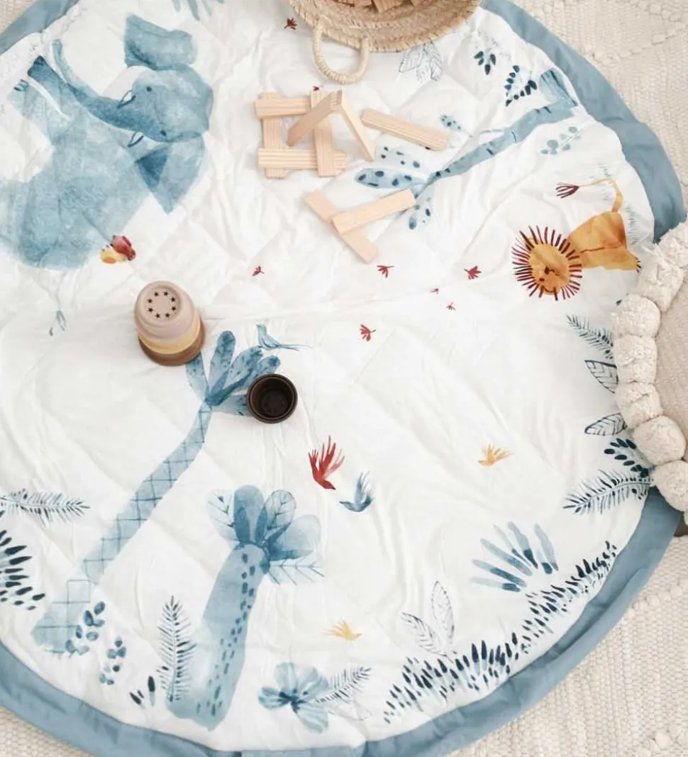 Flot Play&Go legetøjstæppe i hvid, med et flot jungleprint på toppen i turkise og gule nuancer. Tæppet har en bred, turkis kant hele vejen rundt.