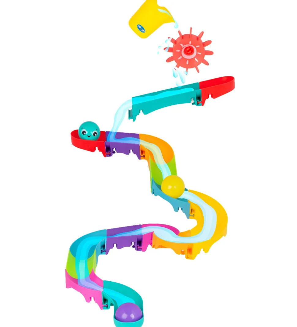 Sjovt Playgro badelegetøj som indeholder 21 farverige dele, som kan samles til en vandbane. Delene sættes nemt sammen, for at skabe en sjov vandbane hvor vand og de tre medfølgende bolde kan glide ned. Vandbanen kan sættes fast til fliserne eller badekarret, hvor man øverst kan placere en mølle, som vandet hældes over, for at starte vandbanen.