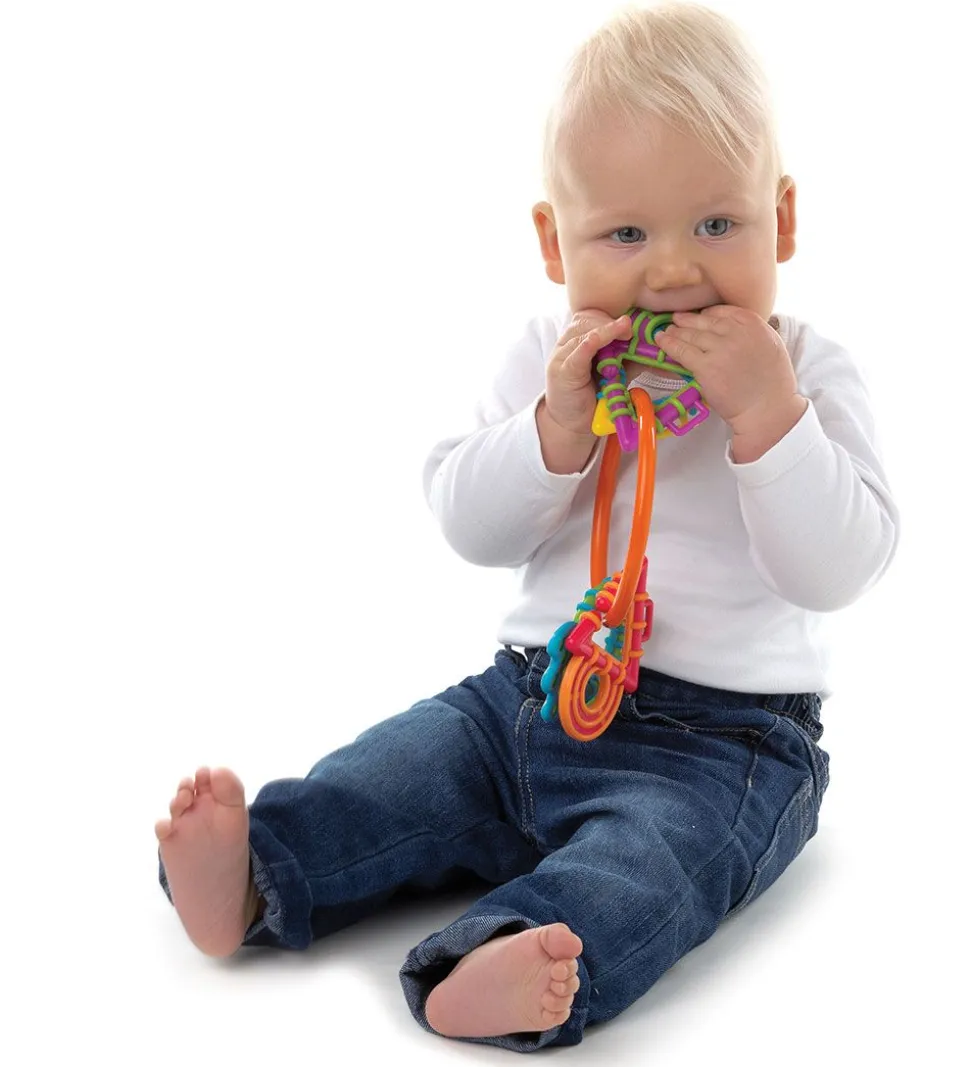 Playgro ranglen er en stor cirkel med bideringe i forskellige forme og strukturer, som er perfekt til de kløende gummer.