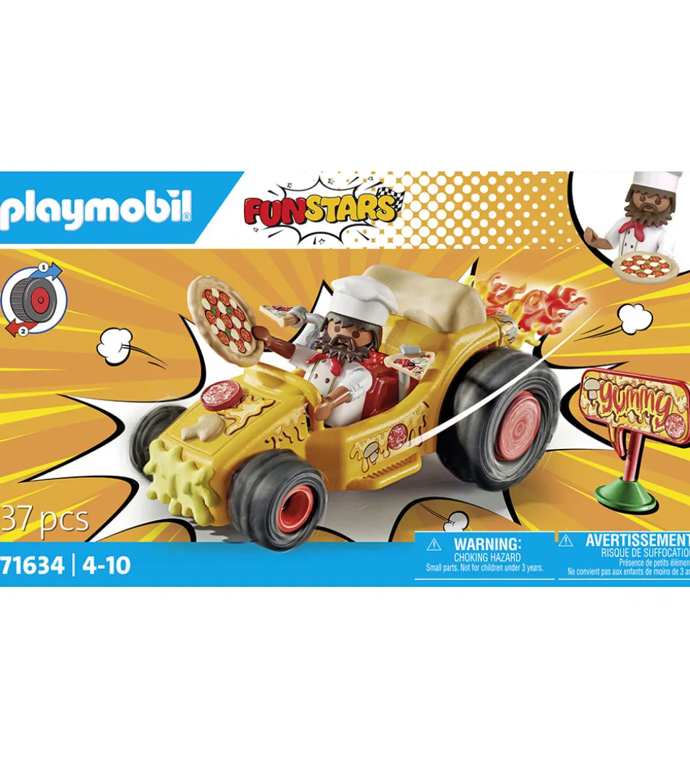 Sejt Playmobil Funstars sæt med i alt 37 dele, der samles til en pizzabager-figur med sin pizza-kart, som har tilbagetrækningsmotor. Der medfølger tilbehør.