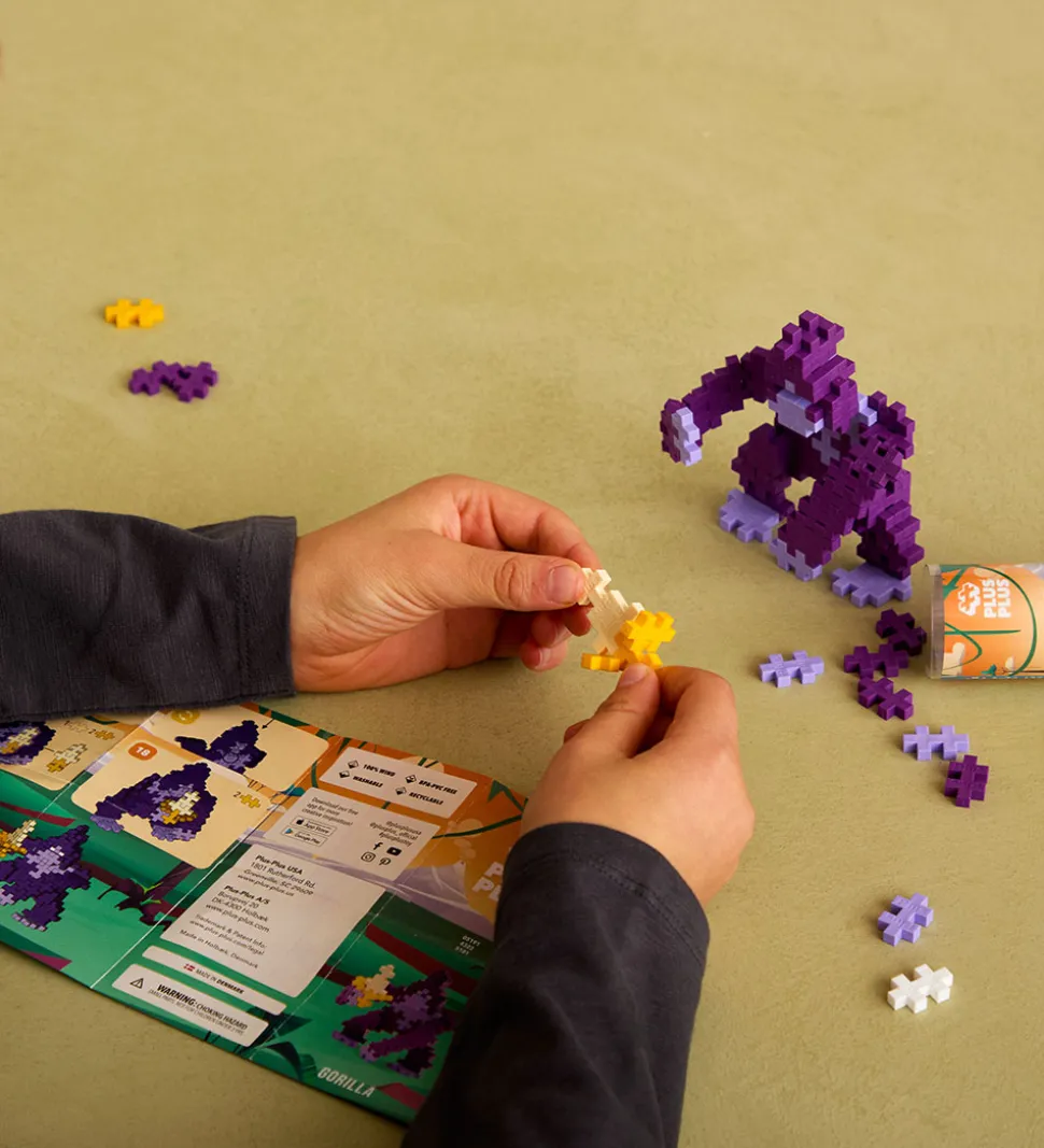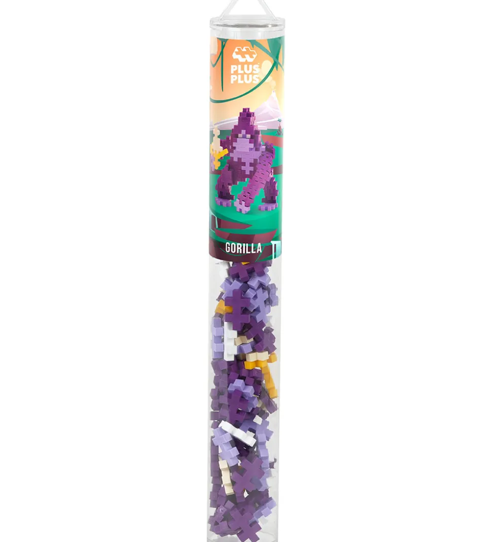 Sjove Plus-Plus klodser i et sæt med et Gorilla-tema, som indeholder 100 klodser samt en byggeinstruktion til inspiration.