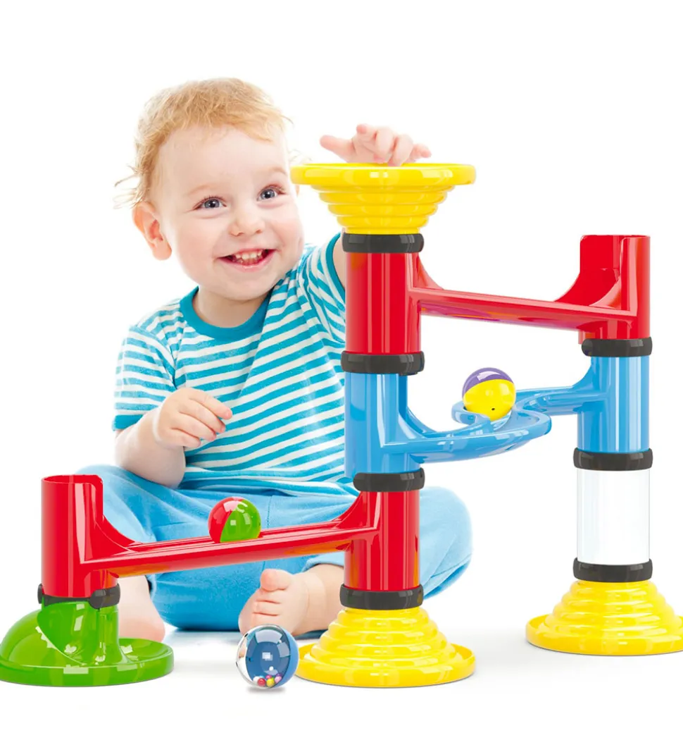 Fin Quercetti kuglebane i fine farver, der kan samles på flere måder. I æsken medfølger: