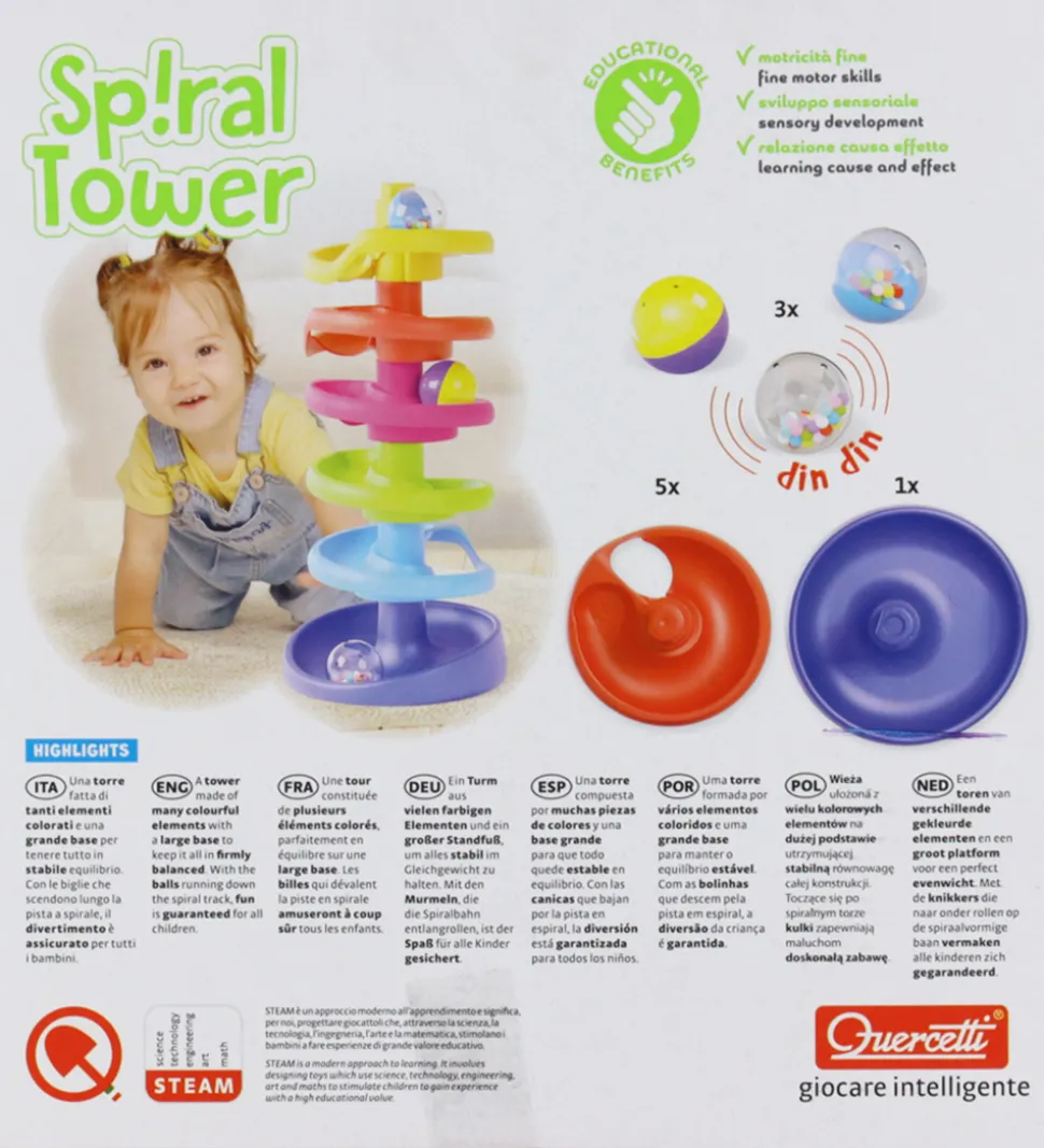 Fin Quercetti kuglebane i fine farver, der samles til et spiral-tårn. I æsken medfølger: