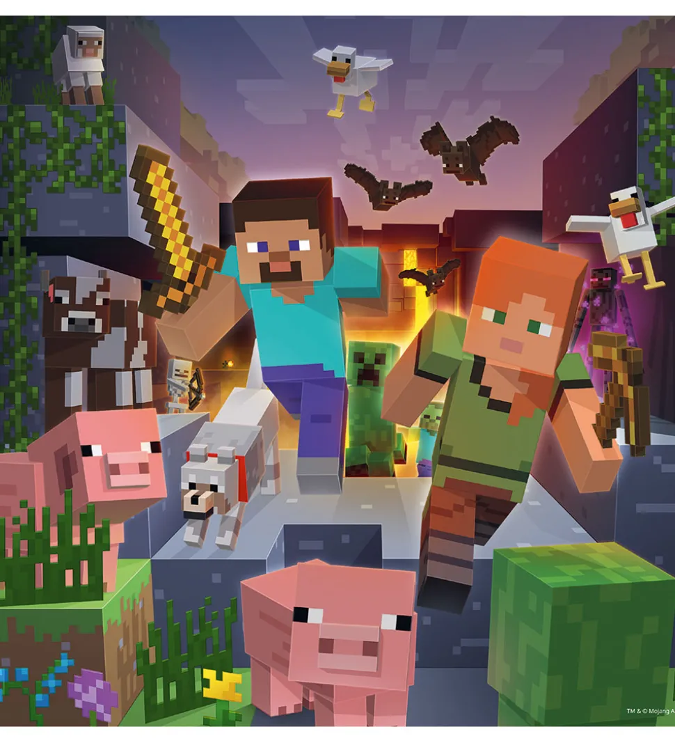 Puslespillene består af 49 brikker hver. Puslespillene har tre forskellige motiver, der viser populære figurer og scener fra Minecraft-verdenen. Det perfekte valg for små fans af det ikoniske spil.