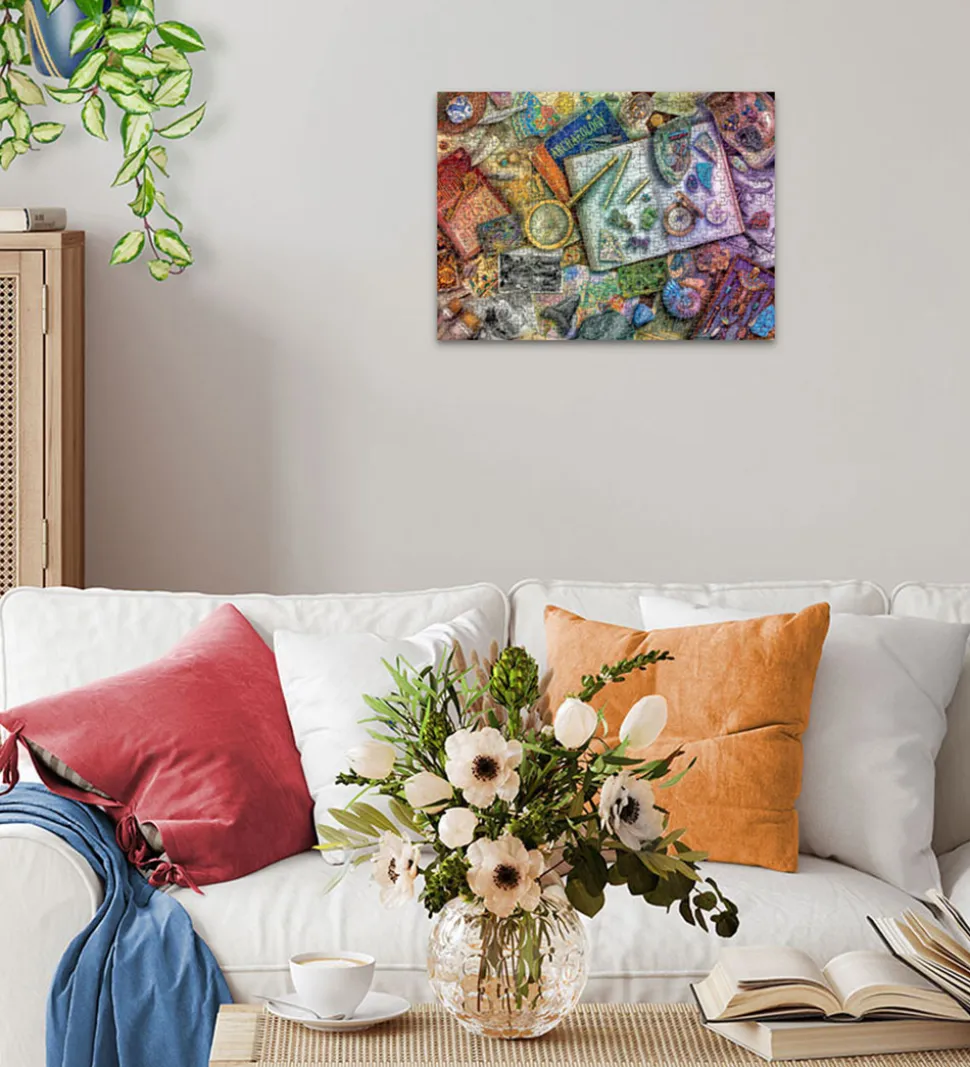 Flot Ravensburger puslespil med et motiv inspireret af en arkæologs skrivebord.
