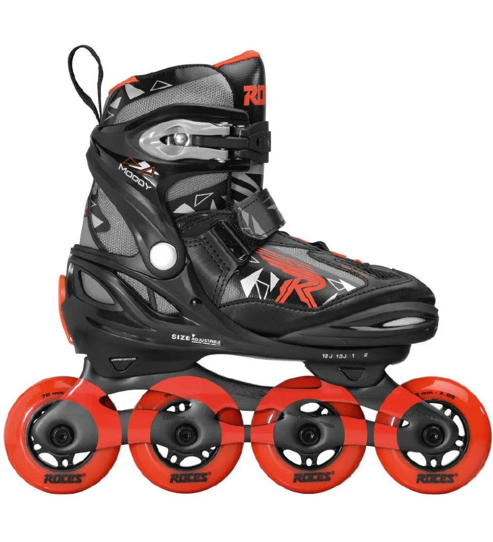 Rulleskøjterne er justerbare i størrelsen, hvilket vil sige at barnet kan vokse med rulleskøjterne. På højre rulleskøjte er der en god bremseklods bagpå. De indstilles nemt til fodstørrelsen ved at dreje på en rød del ved hælen. Roces rulleskøjterne har hjul i hård gummi og ABEC 3 kuglelejer.