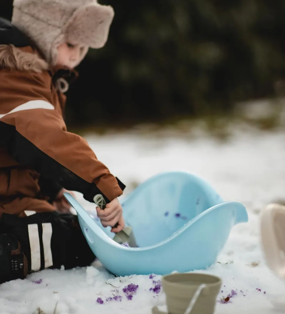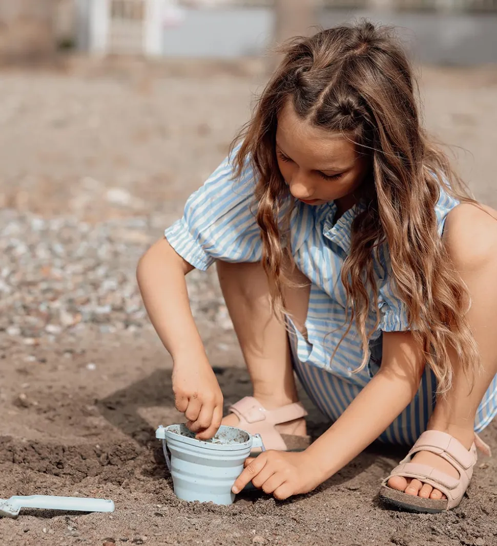 Scrunch spanden har et praktisk, skridsikkert håndtag der passer perfekt ind i barnets hånd. Spanden er lavet af foldbart silikone, og er derfor nem at have med i strandtasken eller kufferten. Der medfølger en lille skovl med en spids form, som gør det let at grave i sandet.