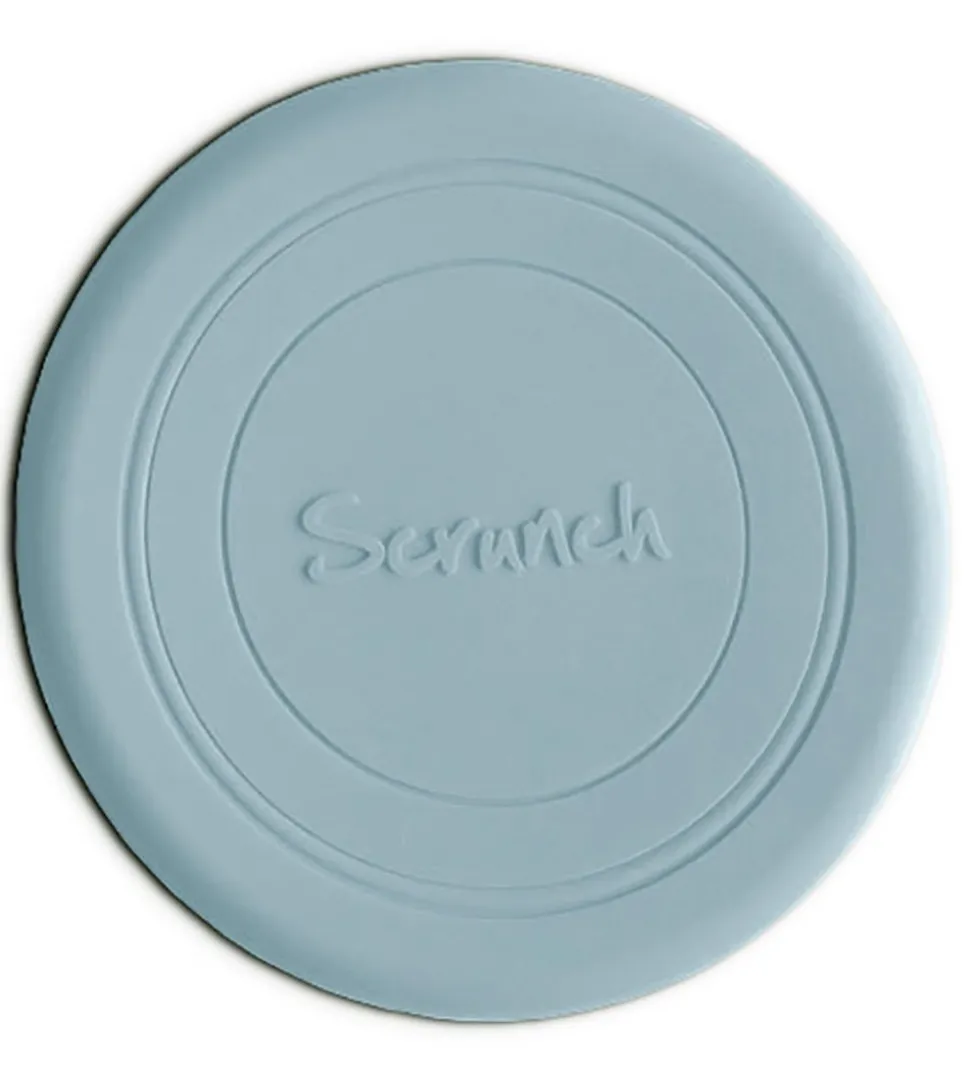 Praktisk Scrunch frisbee i ensfarvet lyseblå med “Scrunch” skrevet henover midten.