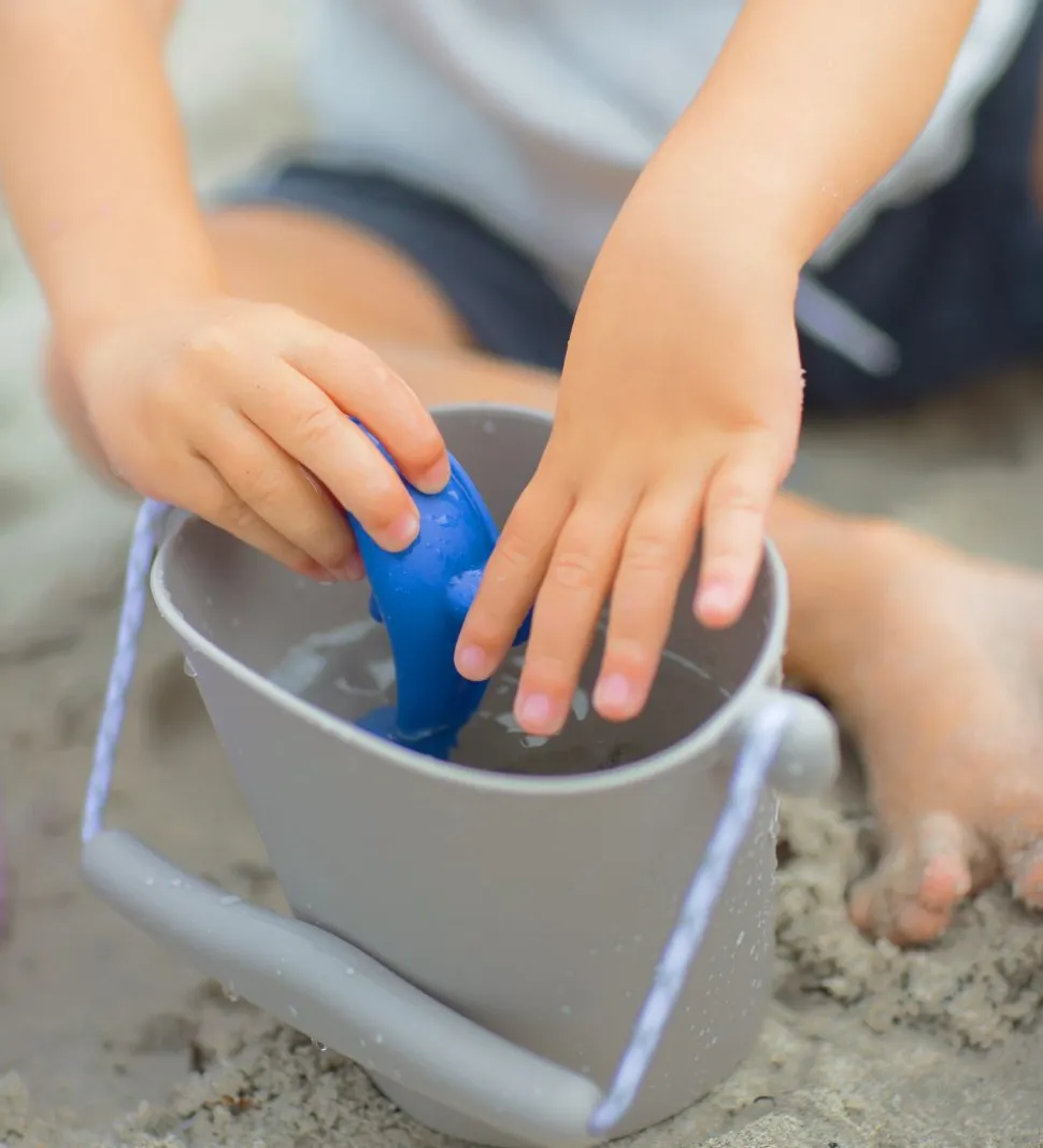 Scrunch spanden kan rumme 1,5 liter. Den er lavet af fleksibelt, blødt og foldbart silikone, så den er let at have med i strandtasken eller kufferten. Spanden har et praktisk, skridsikkert håndtag der passer perfekt ind i barnets hånd.