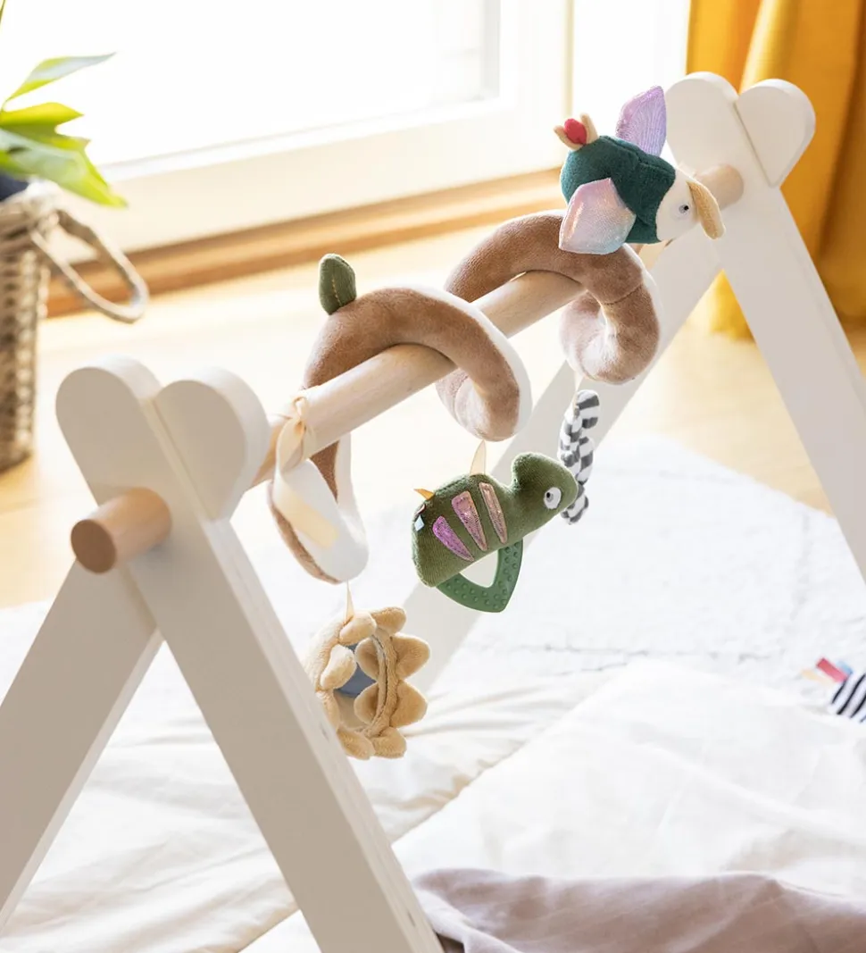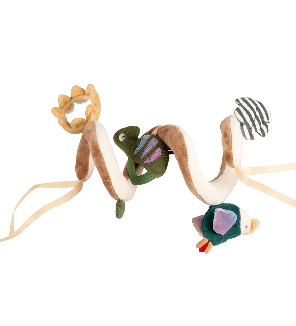 Sebra aktivitetsspiralen har vedhæng med forskellige aktiviteter. Små fingre kan kramme det stribede knitreblad og udforske spejlbilledet i den lille bløde sol, der har et brudsikkert babyspejl i midten. Kamæleonen Carley og tukanen Tully har dele med en changerende effekt og spændende nulreflapper.