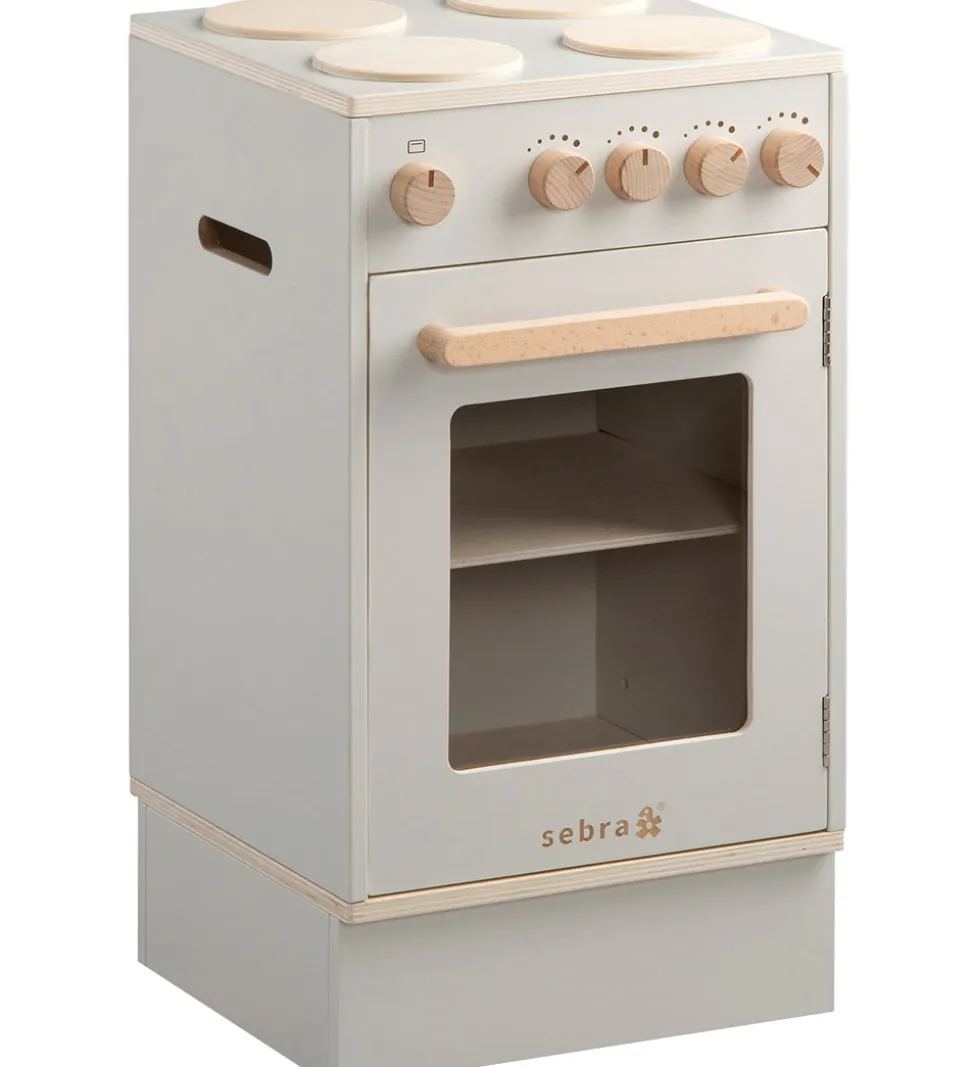 Fint Sebra legekøkken i form af et komfur med ovn af træ malet i en beige nuance.
