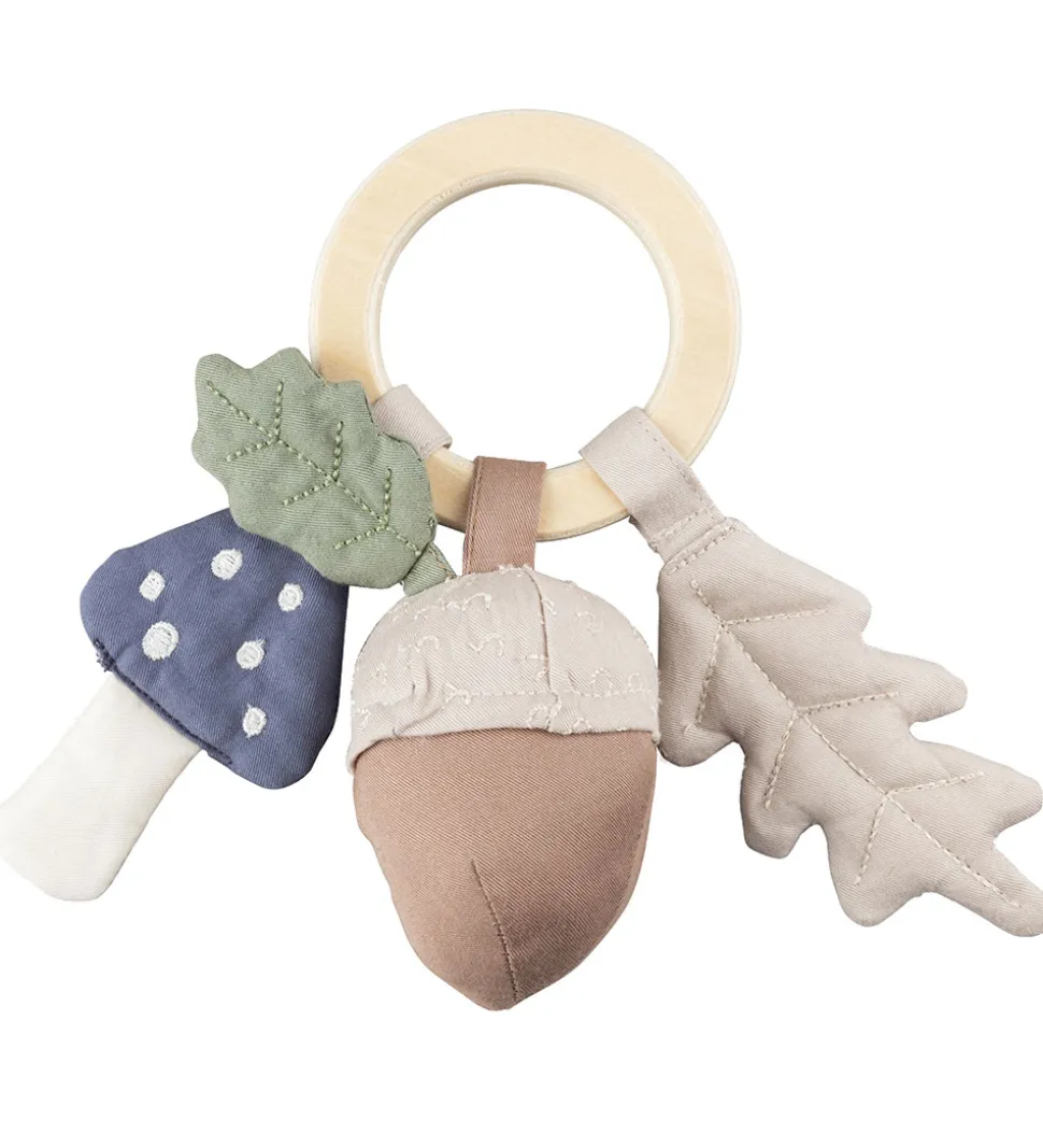 Sebra ranglen består af en ring af lyst træ med tre vedhæng, og agernet rasler, når man ryster det.