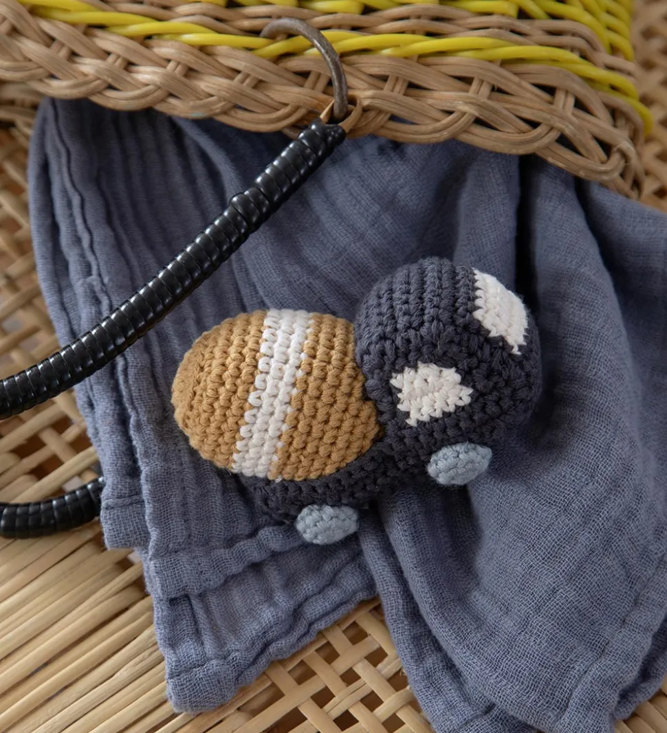 Den hæklede del på ranglen er håndlavet, og derfor er hver rangle unik.