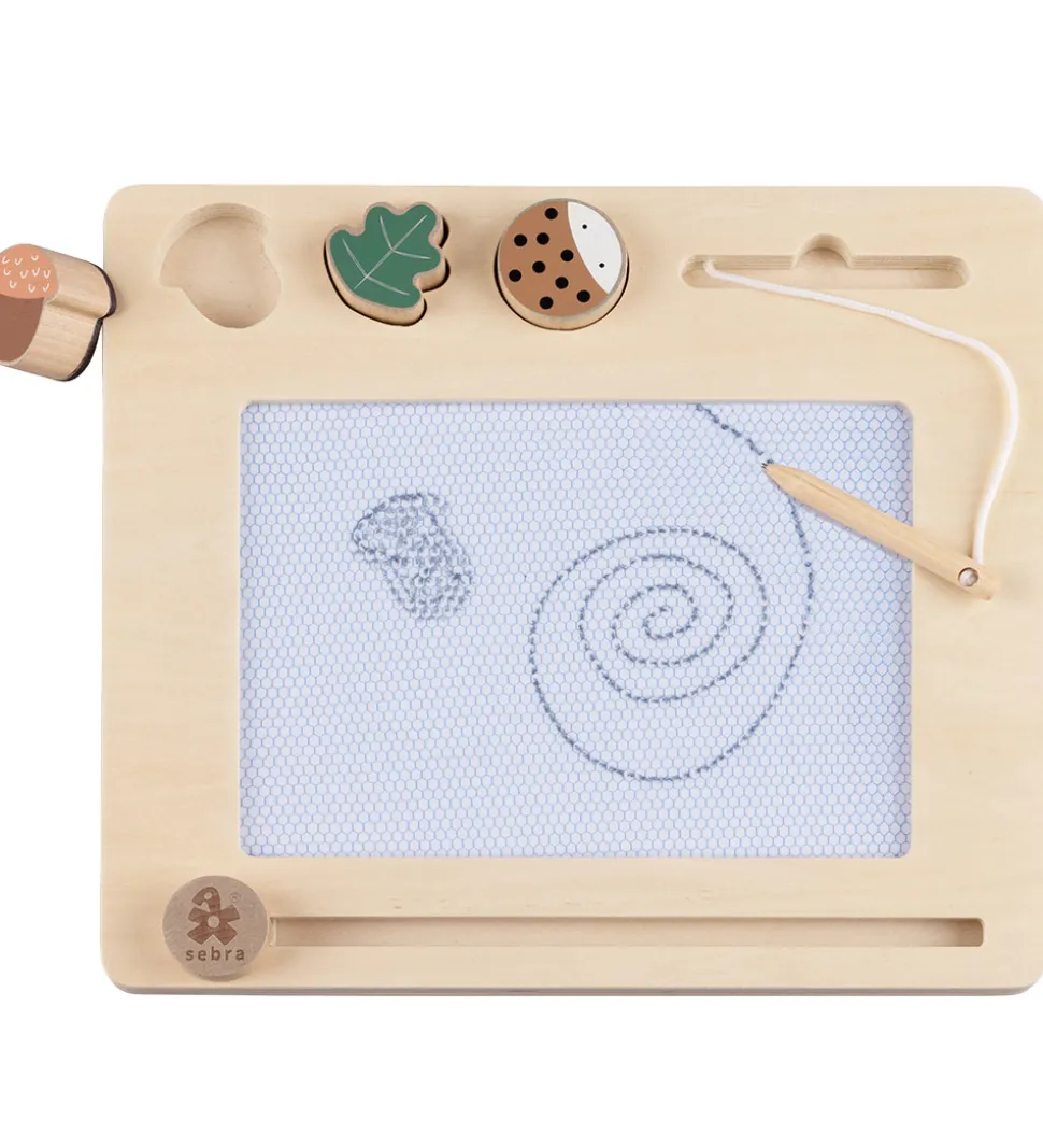 Sebra tegnetavlen kan bruges igen og igen. Med den medfølgende pen, kan man tegne lige, hvad man vil, og ved at skubbe en skyder i bunden hen over pladen, viskes tegningen ud, og man kan begynde på en ny. Der medfølger 3 stempler af træ med form et agern, et blad og en mariehøne.