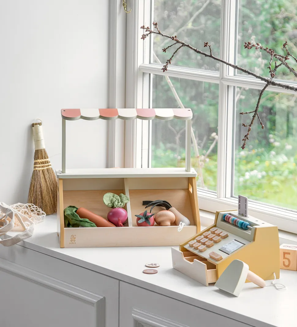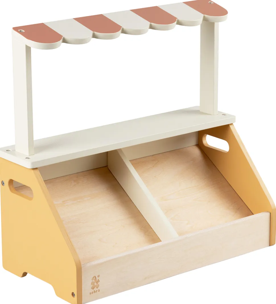 Trælegetøjet gør det sjovt at lege købmand og kan være med til at udvikle barnets sociale evner og indlevelse gennem rollespil. Markedsboden passer perfekt til kasseapparatet fra Sebra.