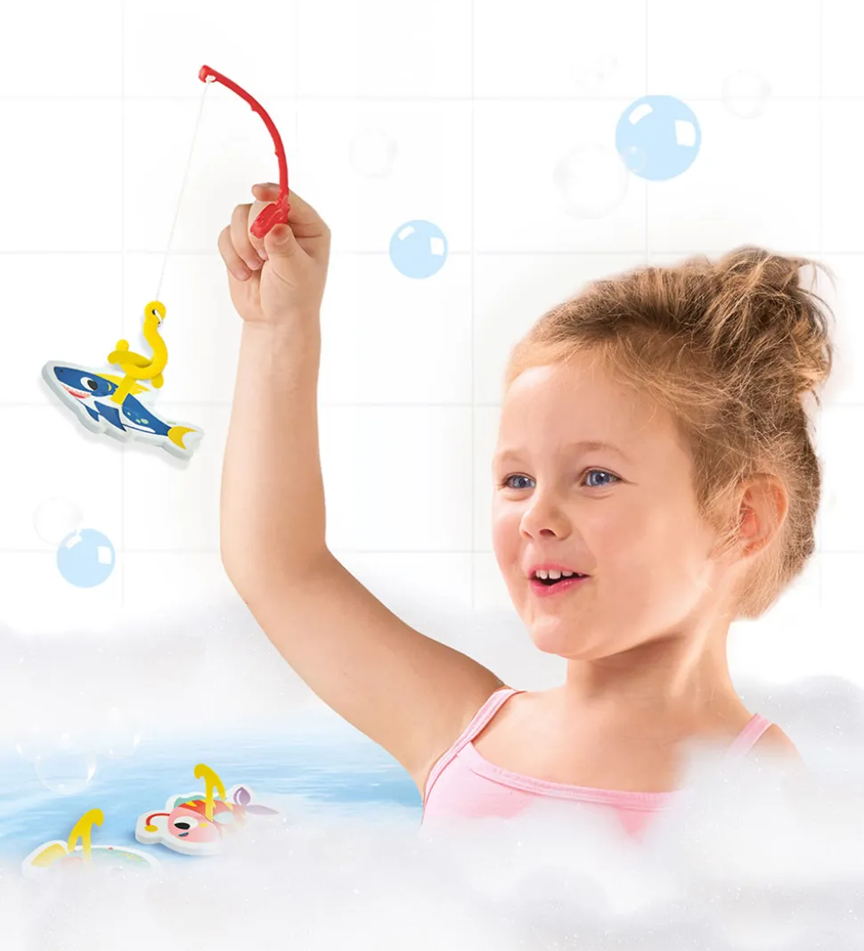 Farverigt SES Creative badelegetøj, der omfatter sjove, flydende figurer med fiskemotiver i lys lilla, pink og blå. SES Creative giver en spændende oplevelse i badet med et engagerende fiskespil for de små.