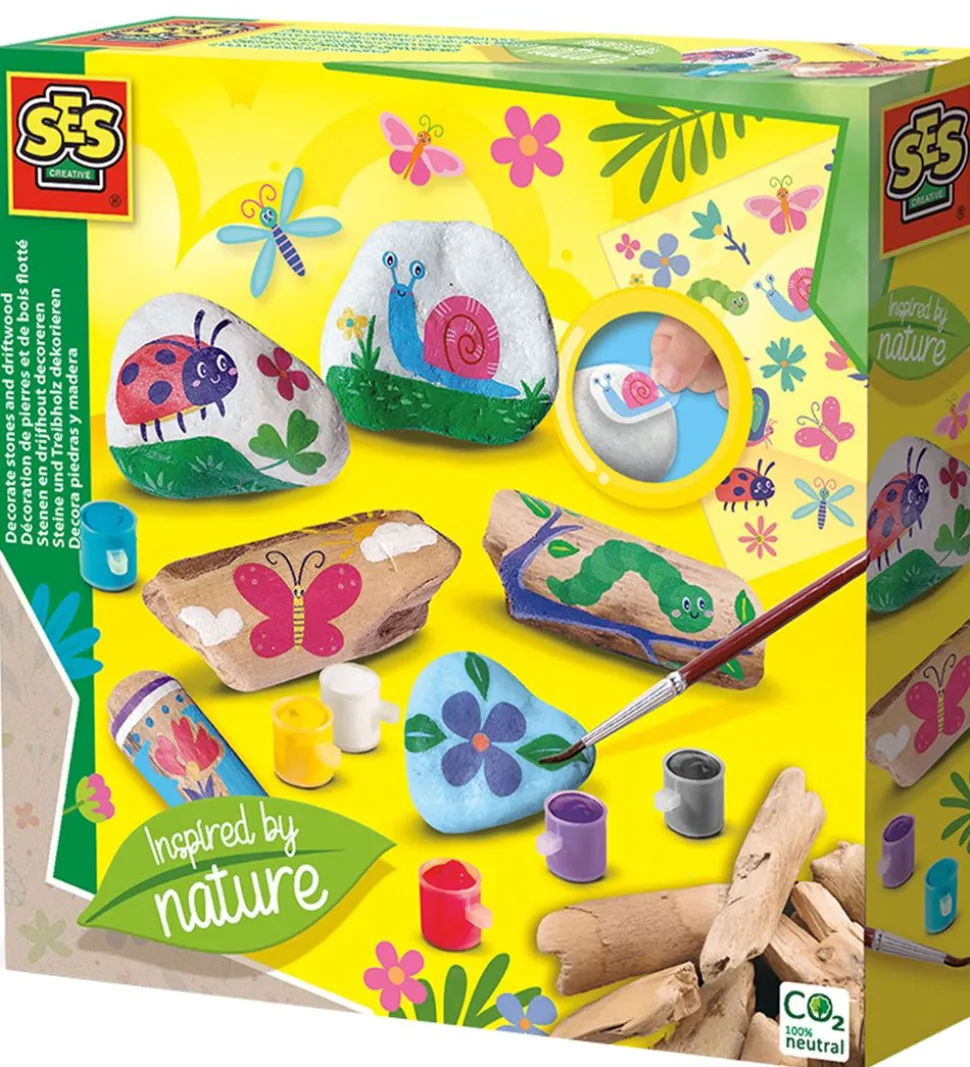 SES Creative malesættet er perfekt til de kreative små, som vil skabe deres egen leg. Med sættet kan man male de tre sten samt drivtømmer der medfølger. Derefter kan de dekoreres med sjove klistermærker. Man kan også male og dekorere sten man selv finder.