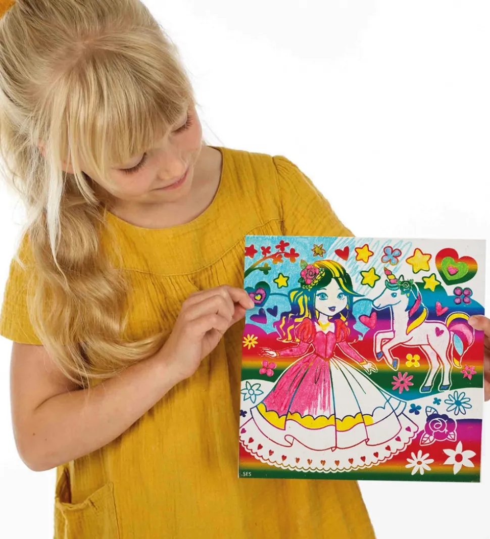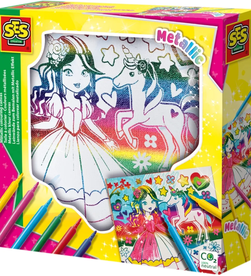 SES Creative farvesættet består af et lærred med en prinsesse og en enhjørning på samt 6 tusser i forskellige farver. Motivet er lavet med en metallisk effekt med mulighed for at farvelægge de tomme pladser.
