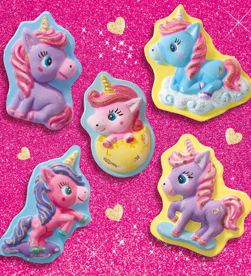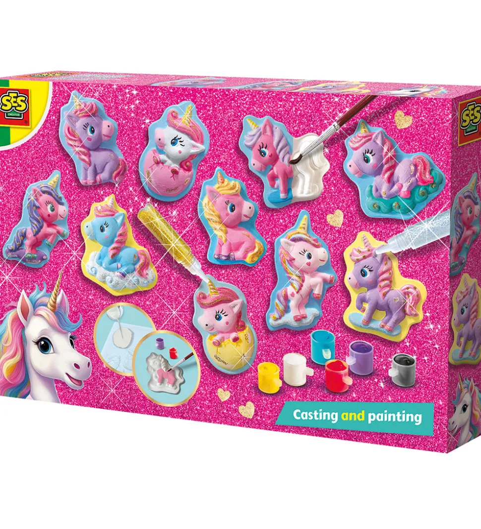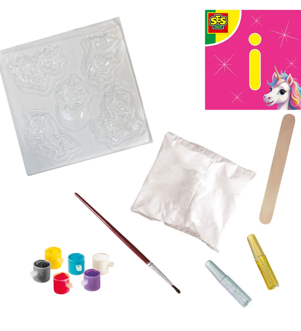 Underholdende SES Creative kreasæt med enhjørningetema. Kreasættet bruges til at støbe små enhjørninge-figurer som man derefter kan male. Kreasættet indeholder følgende:
